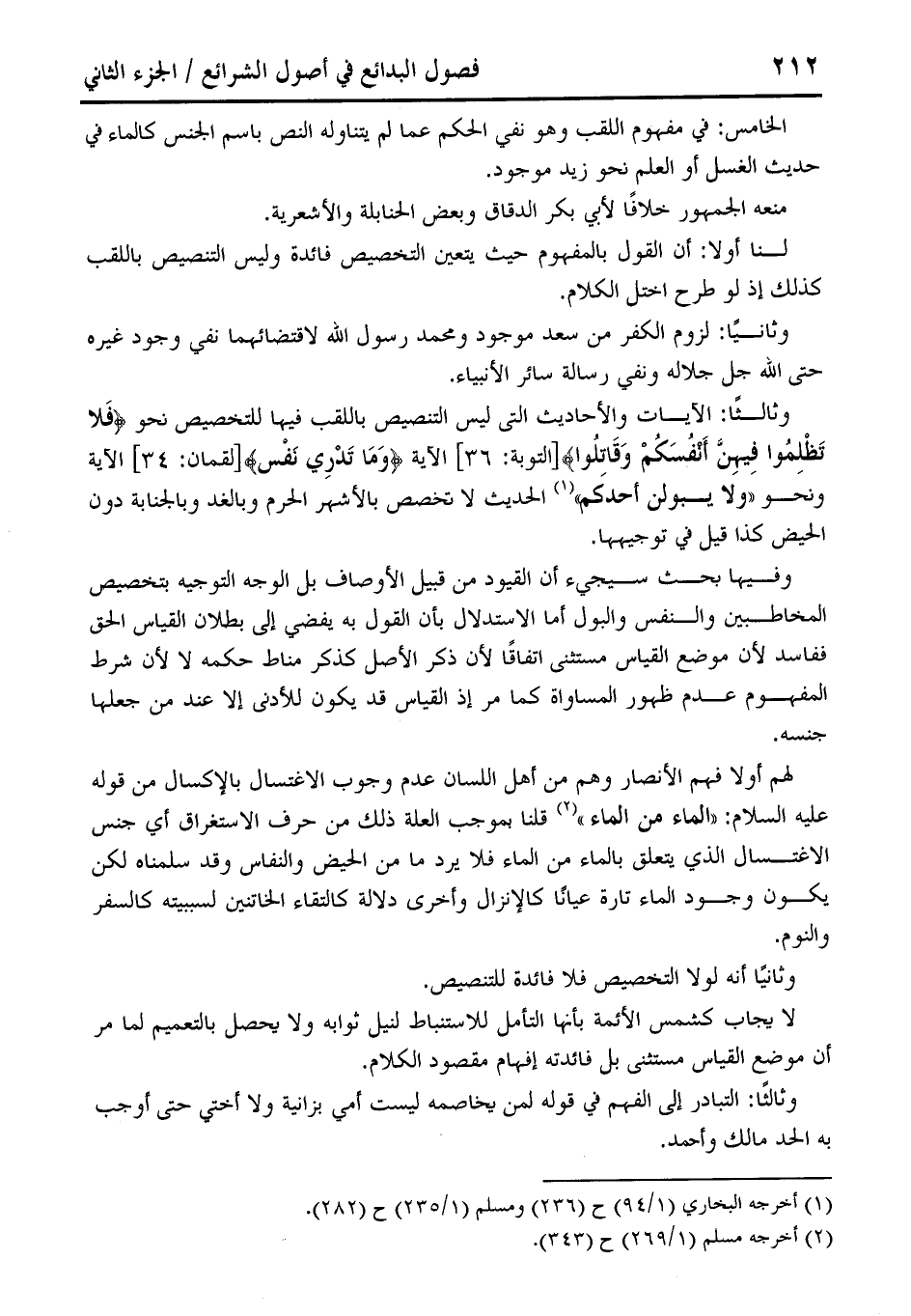 وثالثًا: الآيات والأحاديث التي ليس التنصيص باللقب فيها للتخصيص نحو {فَلَا تَظْلِمُوا فِيهِنَّ أَنْفُسَكُمْ وَقَاتِلُوا} [التوبة: 36] الآية {وَمَا تَدْرِي نَفْسٌ} [لقمان: 34] الآية ونحو "ولا يبولن أحدكَم" (¬1) الحديث لا تخصص بالأشهر الحرم وبالغد وبالجنابة دون الحيض كذا قيل في توجيهها.