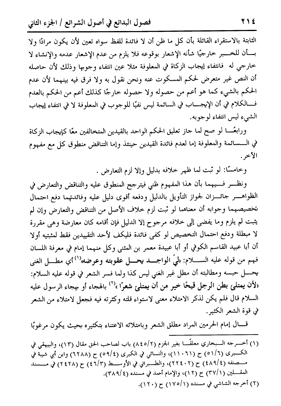 ونظر فيهما بأن هذا المفهوم ظني فيترجح المنطوق عليه والتناقض والتعارض في الظواهر جائزان لجواز التأويل بالدليل ودفعه أقوى دليل علمِه وفائدتهما دفع احتمال تخصيصهما وجوابه أن معناهما لو ثبت لزم خلاف الأصل من التناقض والتعارض وإن لم يثبت لم يلزم وما يفضى إلى خلافه مرجوح إلا الدليل فإن أقامه كان معارضة وهي مقررة لا مبطلة ودفع احتمال التخصيص لو كفى فائدة فليكف لأحد التقييدين فقط لمثبتيه أولا أن أبا عبيد القاسم الكوفي أو أبا عبيدة معمر بن المثنى وكل منهما إمام في معرفة اللسان فهم من قوله عليه السلام: "ليّ الواجد يحل عقوبته وعرضه" (¬1) أي مطل الغنى يحل حبسه ومطالبته أن مطل غير الغنى ليس كذا ولما فسر الشعر في قوله عليه السلام: "لأن يمتلئ بطن الرجل قيحًا خير من أن يمتلئ شعرًا" (¬2) بالهجاء أو بهجاء الرسول عليه السلام قال فلم يكن لذكر الامتلاء معنى لاستواء قلته وكثرته فيه فجعل لامتلاء من الشعر في قوة الشعر الكثير.