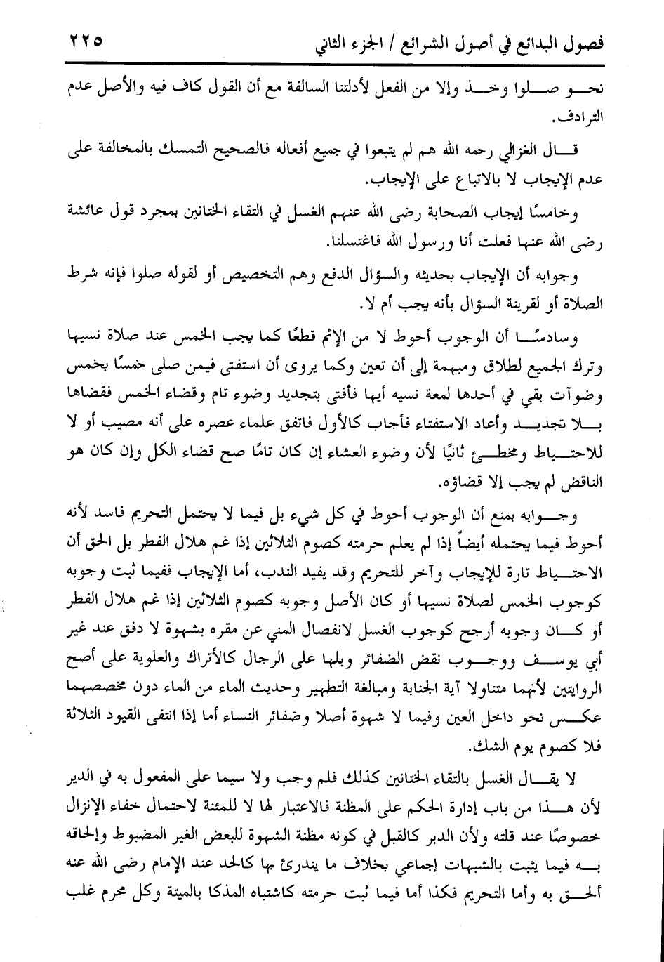 وسادسًا أن الوجوب أحوط لا من الإثم قطعًا كما يجب الخصر عند صلاة نسيها وترك الجميع لطلاق ومبهمة إلى أن تعين وكما يروى أن استفتى فيمن صلى خمسًا بخمس وضوآت بقي في أحدها لمعة نسيه أيها فأفتى بتجديد وضوء تام وقضاء الخمس فقضاها بلا تجديد وأعاد الاستفتاء فأجاب كالأول فاتفق علماء عصره على أنه مصيب أو لا للاحتياط ومخطئ ثانيًا لأن وضوء العشاء إن كان تامًا صح قضاء الكل وإن كان هو الناقض لم يجب إلا قضاؤه.