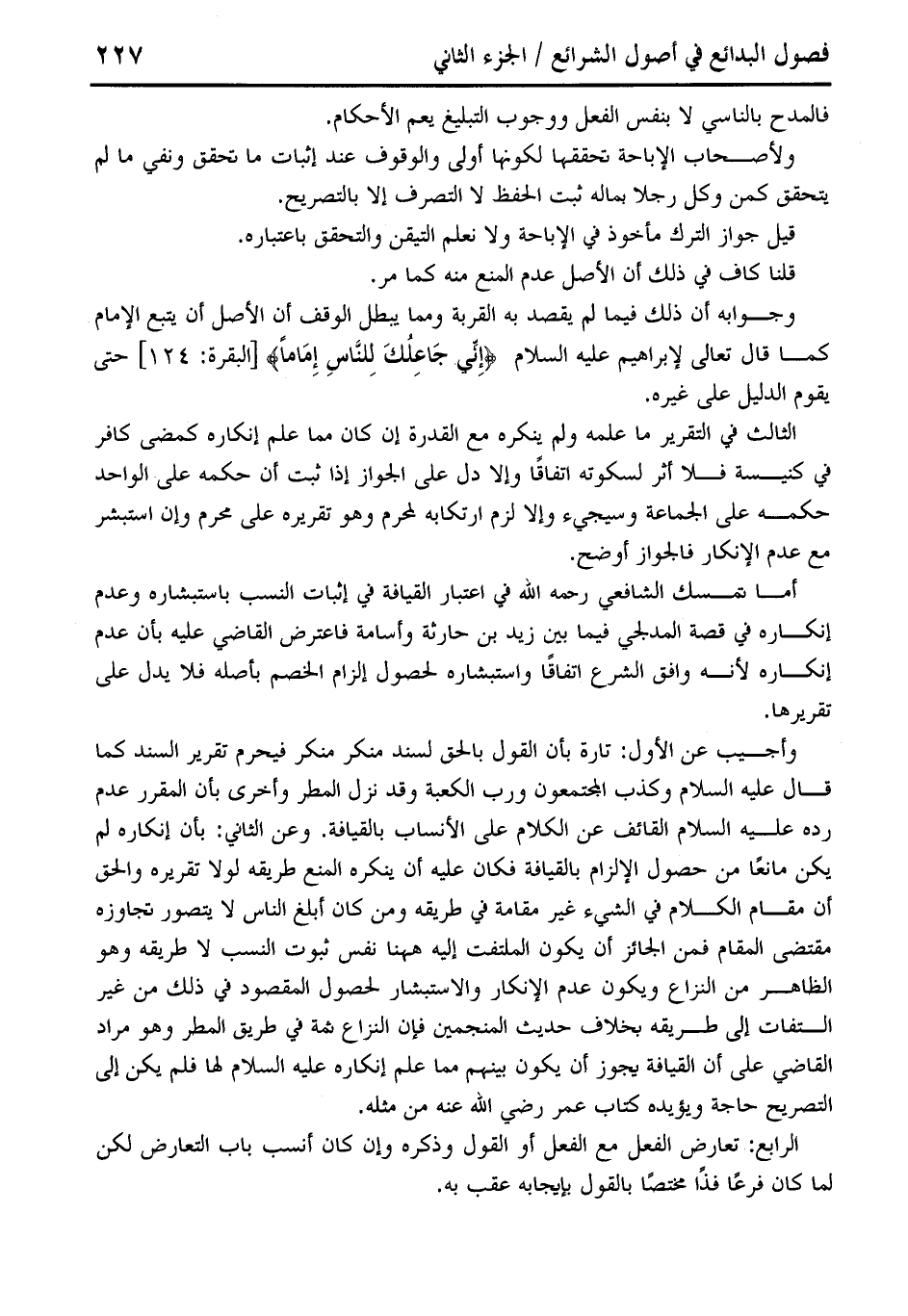 أما تمسك الشافعي رحمه الله في اعتبار القيافة في إثبات النسب باستبشاره وعدم إنكاره في قصة المدلجي فيما بين زيد بن حارثة وأسامة فاعترض القاضي عليه بأن عدم إنكاره لأنه وافق الشرع اتفاقًا واستبشاره لحصول إلزام الخصم بأصله فلا يدل على تقريرها.