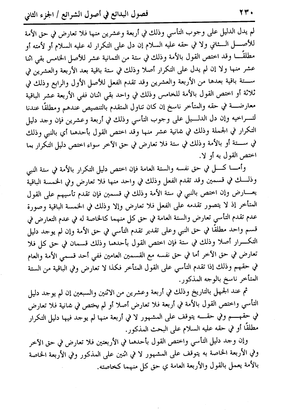 وأما كل في حق نفسه والستة العامة فإن اختص دليل التكرار بالأمة في ستة النبي وذلك في قسمين وقد تقدم الفعل وذلك في واحد منها فلا تعارض وفي الخمسة الباقية يعارض وإن اختص بالنبي في ستة الأمة وذلك في قسمين فإن تقدم تأسيهم على القول المتأخر إذ لا يتصور تقدمه على الفعل فلا تعارض وإلا وذلك في الخمسة الباقية وصورة عدم تقدم التأسي تعارض والستة العامة في حق كل منهما كالخاصة له في عدم التعارض في قسم واحد مطلقًا في حق النبي وعلى تقدير تقدم التأسي في حق الأمة وإن لم يوجد دليل التكرار أصلا وذلك في ستة فإن اختص القول بأحدهما وذلك قسمان في حق كل فلا تعارض في حق الآخر أما في حق نفسه مع القسمين العامين ففط أحد قسمي الأمة والعام في حقهم وذلك إذا تقدم التأسي على القول المتأخر فكذا لا تعارض وفي الباقية من الستة المتأخر ناسخ بالوجه المذكور.