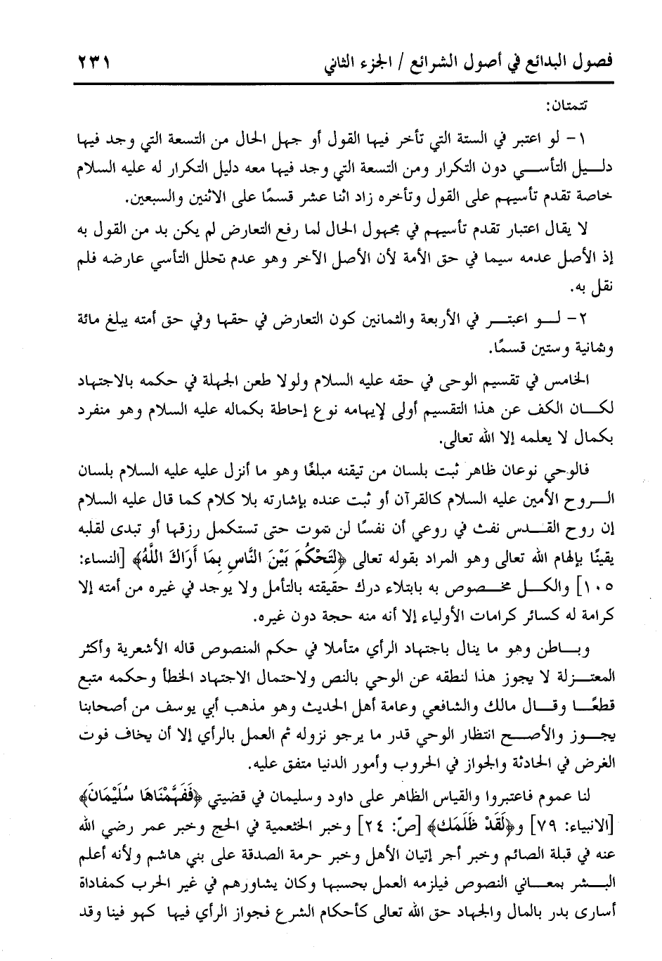 2 - لو اعبتر في الأربعة والثمانين كون التعارض في حقها وفي حق أمته يبلغ مائة وثمانية وستين قسمًا. الخامس في تقسيم الوحى في حقه عليه السلام ولولا طعن الجهلة في حكمه بالاجتهاد لكان الكف عن هذا التقسيم أولى لإيهامه نوع إحاطة بكماله عليه السلام وهو منفرد بكمال لا يعلمه إلا الله تعالى.