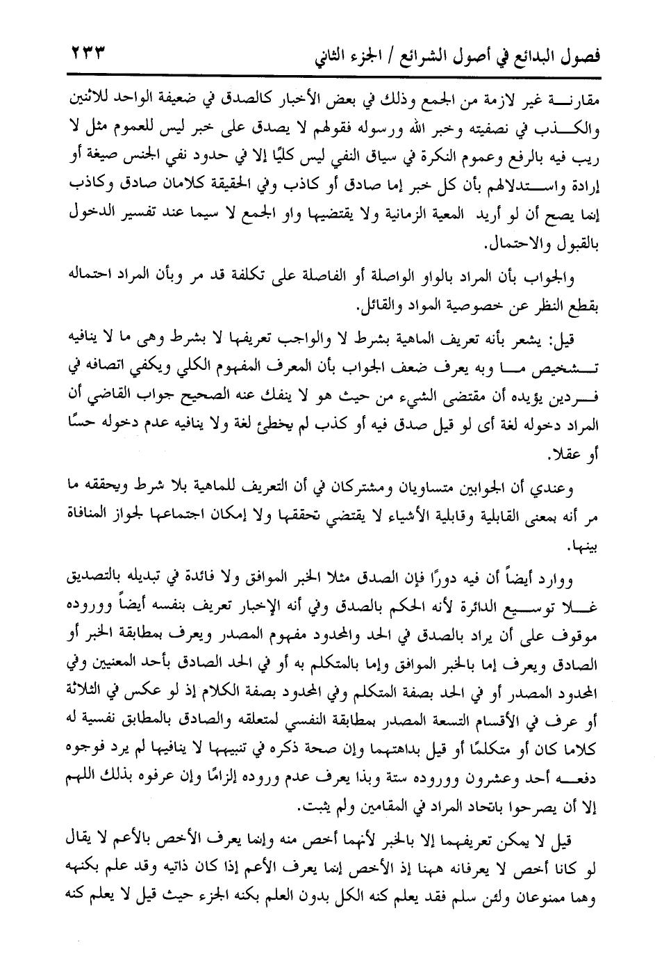 قيل: يشعر بأنه تعريف الماهية بشرط لا والواجب تعريفها لا بشرط وهي ما لا ينافيه تشخيص ما وبه يعرف ضعف الجواب بأن المعرف المفهوم الكلي ويكفي اتصافه في فردين يؤيده أن مقتضى الشيء من حيث هو لا ينفك عنه الصحيح جواب القاضي أن المراد دخوله لغة أي لو قيل صدق فيه أو كذب لم يخطئ لغة ولا ينافيه عدم دخوله حسًا أو عقلا.