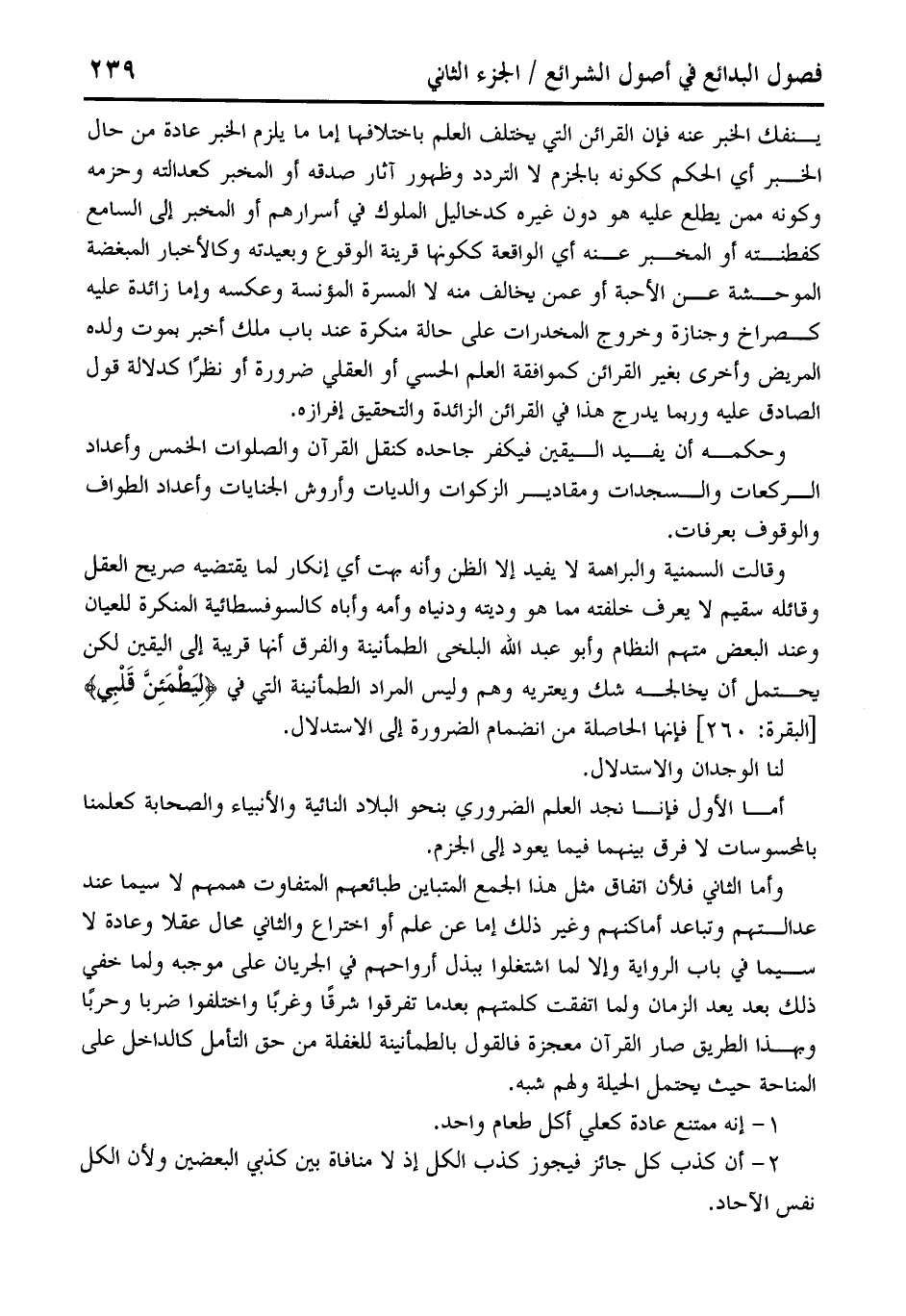 وأما الثاني فلأن اتفاق مثل هذا الجمع المتباين طبائعهم المتفاوت هممهم لا سيما عند عدالتهم وتباعد أماكنهم وغير ذلك إما عن علم أو اختراع والثاني محال عقلا وعادة لا سيما في باب الرواية وإلا لما اشتغلوا ببذل أرواحهم في الجريان على موجبه ولما خفي ذلك بعد يعد الزمان ولما اتفقت كلمتهم بعد ما تفرقوا شرقًا وغربًا واختلفوا ضربا وحربًا وبهذا الطريق صار القرآن معجزة فالقول بالطمأنينة للغفلة من حق التأمل كالداخل على المناحة حيث يحتمل الحيلة ولهم شبه.
