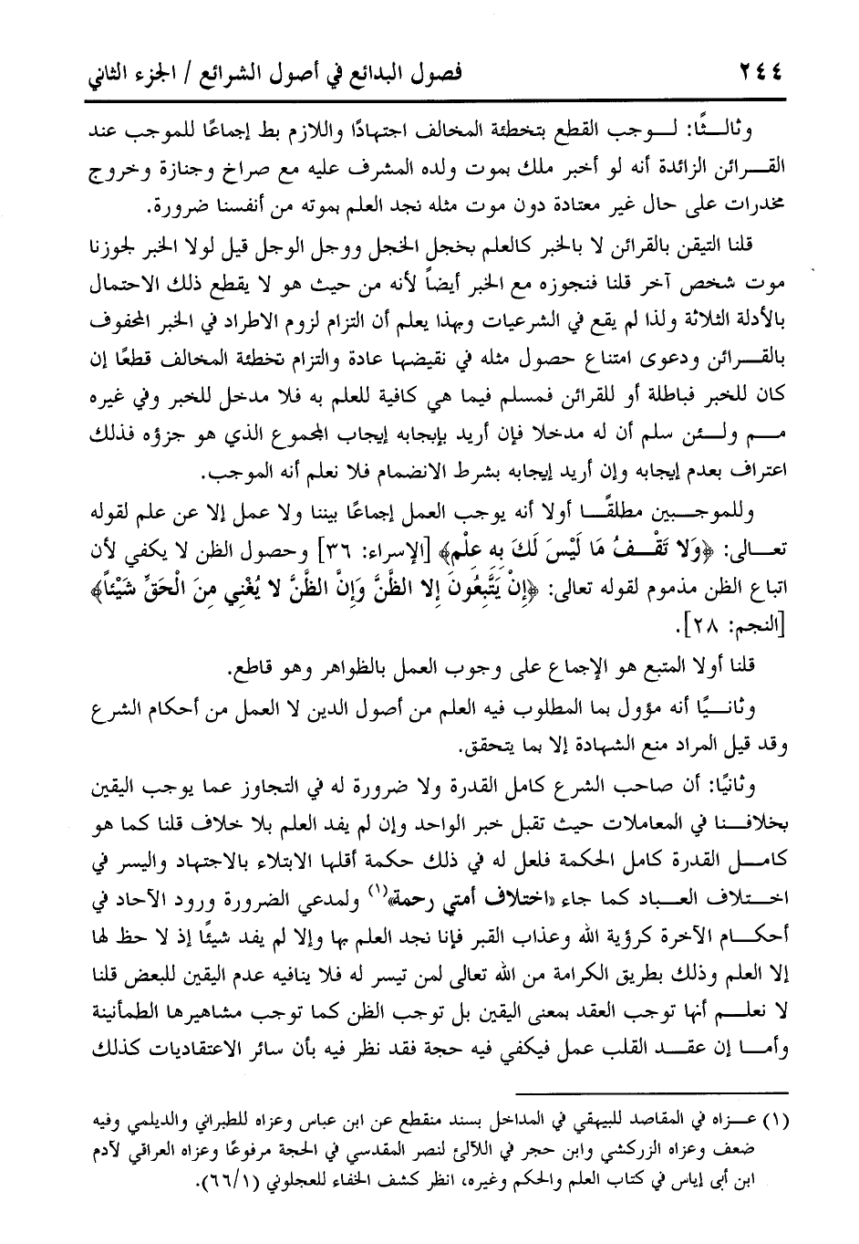 وثانيًا: أن صاحب الشرع كامل القدرة ولا ضرورة له في التجاوز عما يوجب اليقين بخلافنا في المعاملات حيث تقبل خبر الواحد وإن لم يفد العلم بلا خلاف قلنا كما هو كامل القدرة كامل الحكمة فلعل له في ذلك حكمة أقلها الابتلاء بالاجتهاد واليسر في اختلاف العباد كما جاء دا اختلاف أمتي رحمة (¬1) ولمدعط الضرورة ورود الآحاد في أحكام الآخرة كرؤية الله وعذاب القبر فإنا نجد العلم بها وإلا لم يفد شيئًا إذ لا حظ لها إلا العلم وذلك بطريق الكرامة من الله تعالى لمن تيسر له فلا ينافيه عدم اليقين للبعض قلنا لا نعلم أنها توجب العقد بمعنى اليقين بل توجب الظن كما توجب مشاهيرها الطمأنية وأما إن عقد القلب عمل فيكفي فيه حجة فقد نظر فيه بأن سائر الاعتقاديات كذلك