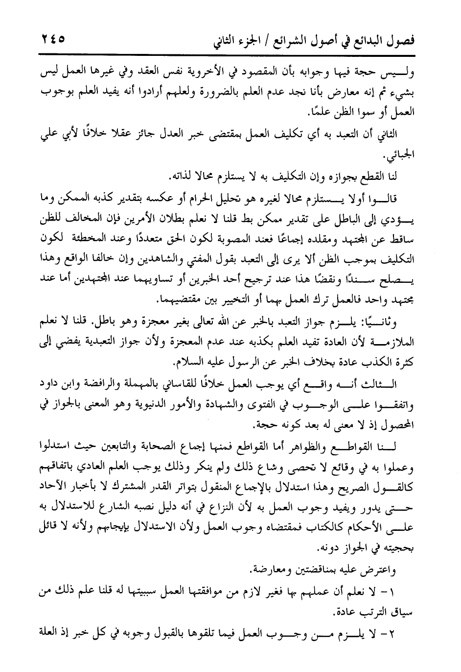 الثاني أن التعبد به أي تكليف العمل بمقتضى خبر العدل جائز عقلا خلافًا لأبي علي الجبائي.