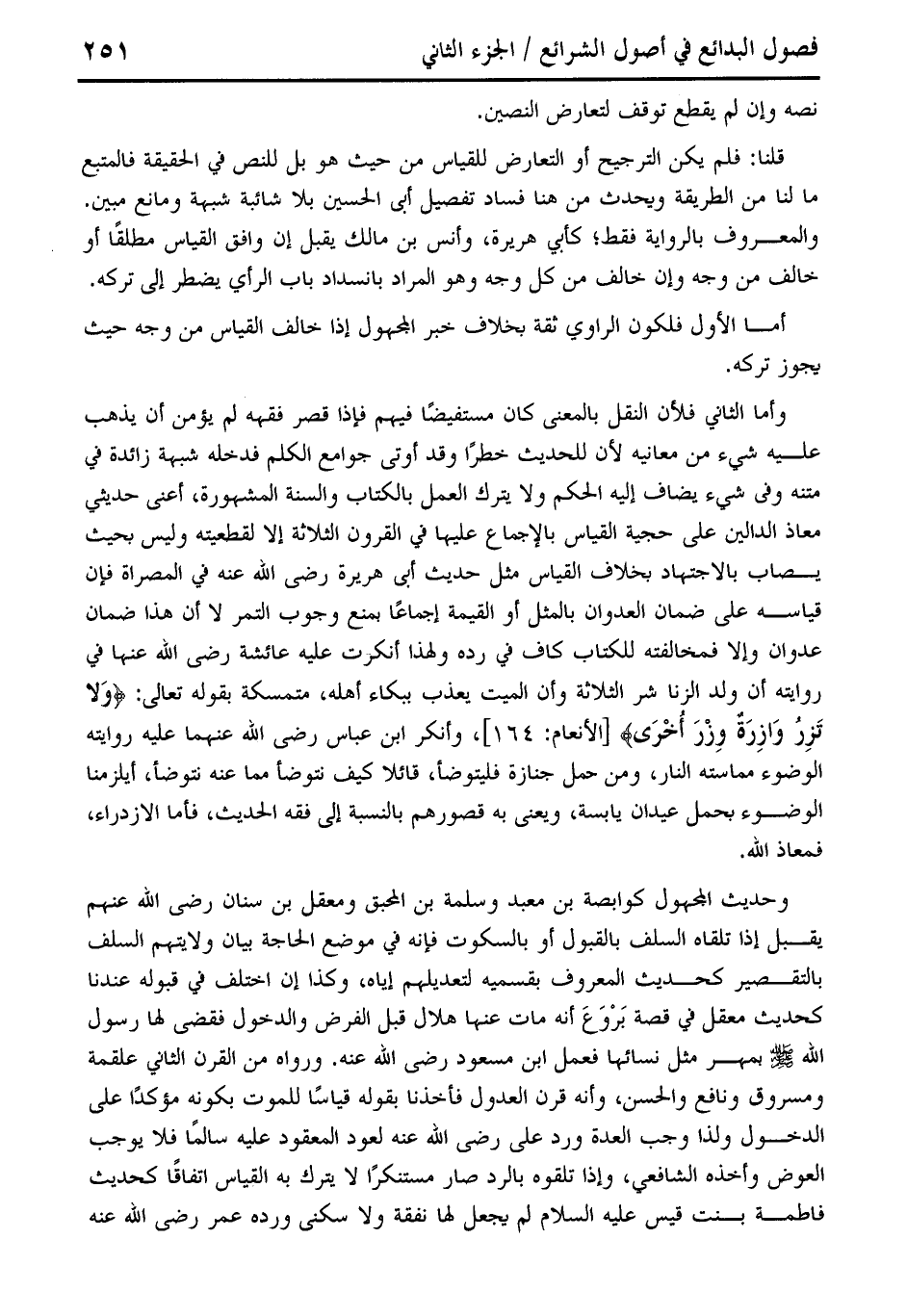 وأما الثاني فلأن النقل بالمعنى كان مستفيضًا فيهم فإذا قصر فقهه لم يؤمن أن يذهب عليه شيء من معانيه لأن للحديث خطرًا وقد أوتى جوامع الكلم فدخله شبهة زائدة في متنه وفي شيء يضاف إليه الحكم ولا يترك العمل بالكتاب والسنة المشهورة، أعنى حديثي معاذ الدالين على حجية القياس بالإجماع عليها في القرون الثلاثة إلا لقطعيته وليس بحيث يصاب بالاجتهاد بخلاف القياس مثل حديث أبى هريرة رضي الله عنه في المصراة فإن قياسه على ضمان العدوان بالمثل أو القيمة إجماعًا بمنع وجوب التمر لا أن هذا ضمان عدوان وإلا فمخالفته للكتاب كاف في رده ولهذا أنكرت عليه عائشة رضي الله عنها في روايته أن ولد الزنا شر الثلاثة وأن الميت يعذب ببكاء أهله، متمسكة بقوله تعالى: {وَلَا تَزِرُ وَازِرَةٌ وِزْرَ أُخْرَى} [الأنعام: 164] وأنكر ابن عباس رضي الله عنهما عليه روايته الوضوء مماسته النار، ومن حمل جنازة فليتوضأ، قائلا كيف نتوضأ مما عنه نتوضأ، أيلزمنا الوضوء بحمل عيدان يابسة، ويعنى به قصورهم بالنسبة إلى فقه الحديث، فأما الازدراء، فمعاذ الله.