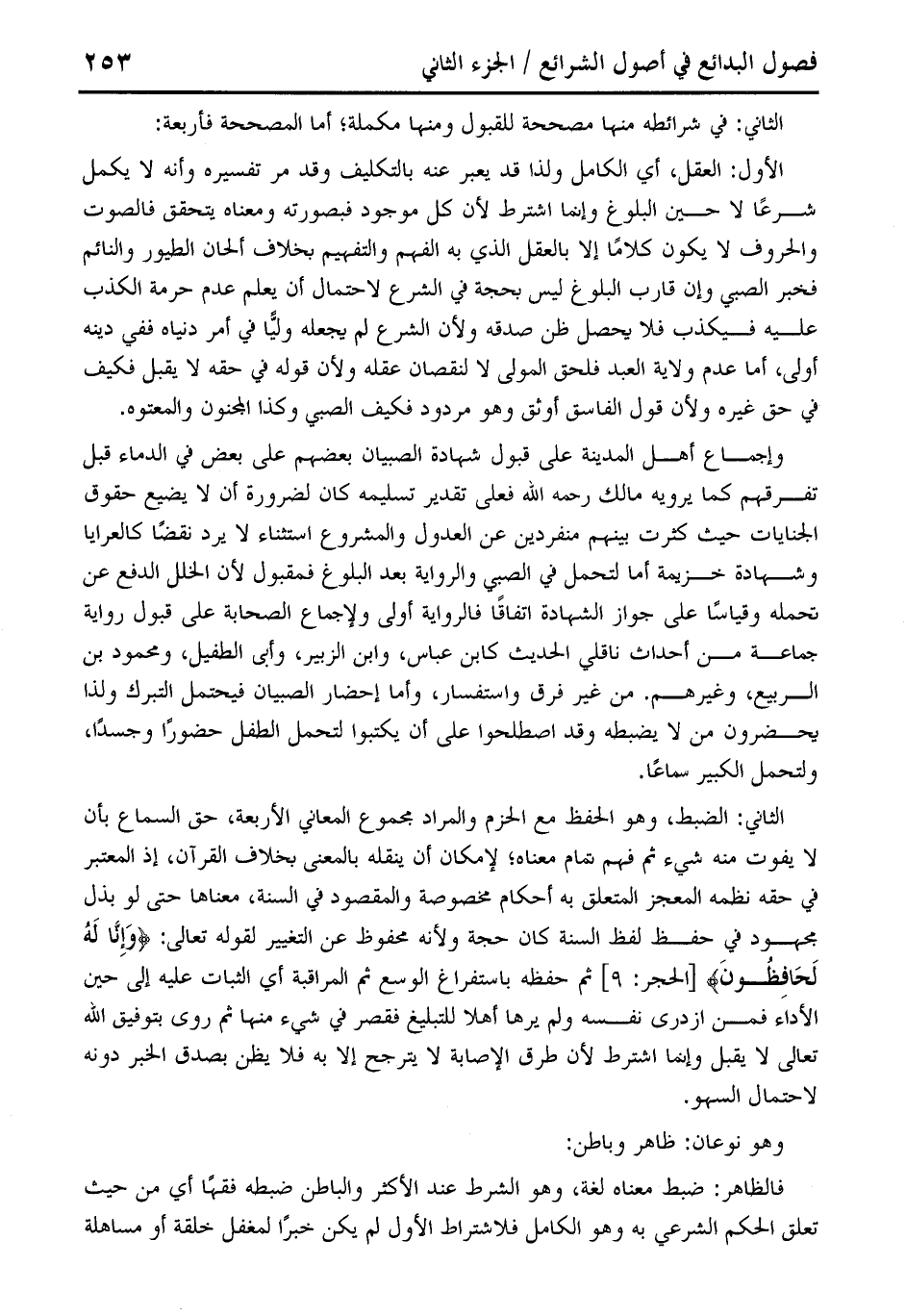 الأول: العقل، أي الكامل ولذا قد يعبر عنه بالتكليف وقد مر تفسيره وأنه لا يكمل شرعًا لا حين البلوغ وإنما اشترط لأن كل موجود فبصورته ومعناه يتحقق فالصوت والحروف لا يكون كلامًا إلا بالعقل الذي به الفهم والتفهيم بخلاف ألحان الطور والنائم فخبر الصبي وإن قارب البلوغ ليس بحجة في الشرع لاحتمال أن يعلم عدم حرمة الكذب عليه فيكذب فلا يحصل ظن صدقه ولأن الشرع لم يجعله وليًّا في أمر دنياه ففي دينه أولى، أما عدم ولاية العبد فلحق المولى لا لنقصان عقله ولأن قوله في حقه لا يقبل فكيف في حق غيره ولأن قول الفاسق أوثق وهو مردود فكيف الصبي وكذا المجنون والمعتوه.