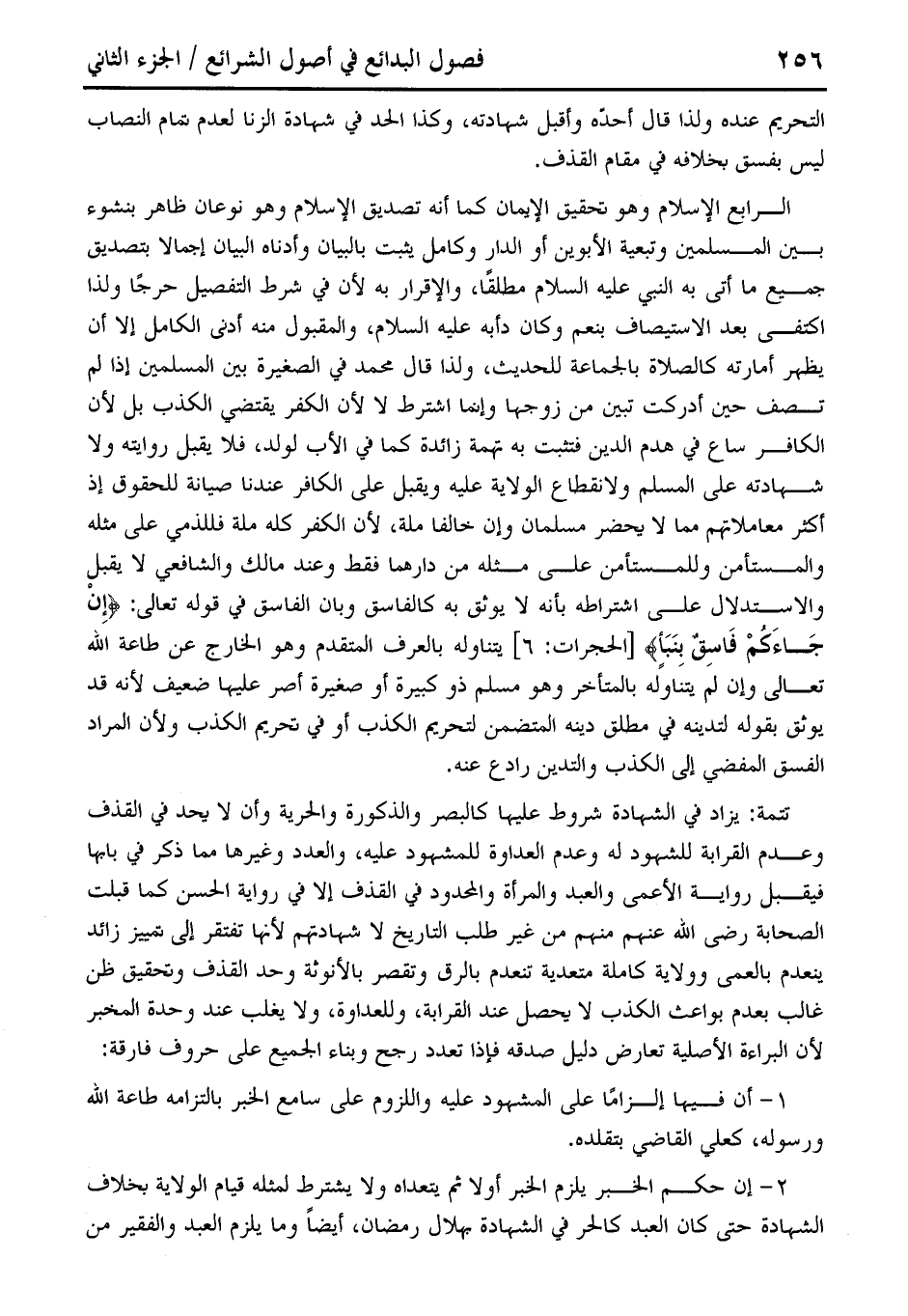 الرابع الإِسلام وهو تحقيق الإيمان كما أنه تصديق الإِسلام وهو نوعان ظاهر بنشوء بين المسلمين وتبعية الأبوين أو الدار وكامل يثبت بالبيان وأدناه البيان إجمالا بتصديق جميع ما أتى به النبي عليه السلام مطلقًا، والإقرار به لأن في شرط التفصيل حرجًا ولذا اكتفى بعد الاستيصاف بنعم وكان دأبه عليه السلام، والمقبول منه أدنى الكامل إلا أن يظهر أمارته كالصلاة بالجماعة للحديث، ولذا قال محمَّد في الصغيرة بين المسلمين إذا لم تصف حين أدركت تبين من زوجها وإنما اشترط لا لأن الكفر يقتضى الكذب بل لأن الكافر ساع في هدم الدين فتثبت به تهمة زائدة كما في الأب لولد، فلا يقبل روايته ولا شهادته على المسلم ولانقطاع الولاية عليه ويقبل على الكافر عندنا صيانة للحقوق إذ أكثر معاملاتهم مما لا يحضر مسلمان وإن خالفا ملة، لأن الكفر كله ملة فللذمي على مثله والمستأمن وللمستأمن على مثله من دارهما فقط وعند مالك والشافعي لا يقبل والاستدلال على اشتراطه بأنه لا يوثق به كالفاسق وبأن الفاسق في قوله تعالى: {إِنْ جَاءَكُمْ فَاسِقٌ بِنَبَإٍ} [الحجرات: 6] يتناوله بالعرف المتقدم وهو الخارج عن طاعة الله تعالى وإن لم يتناوله بالمتأخر وهو مسلم ذو كبيرة أو صغيرة أصر عليها ضعيف لأنه قد يوثق بقوله لتدينه في مطلق دينه المتضمن لتحريم الكذب أو في تحريم الكذب ولأن المراد الفسق المفضي إلى الكذب والتدين رادع عنه.