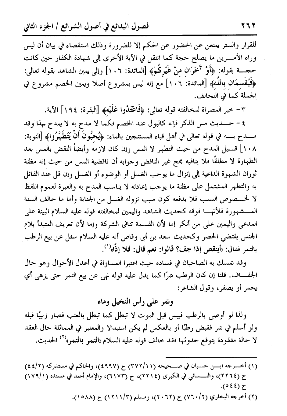 4 - حديث مس الذكر فإنه كالبول عند الخصم فكَما لا مدحِ به لا يمدح بهذا وقد مدح به في قوله تعالى في أهل قباء المستنجين بالماء: {يُحِبُّونَ أَنْ يَتَطَهَّرُوا} [التوبة: 108] قيل المدح من حيث التطهر لا المس وإن كان لازمه وأيضًا النقض بالمس بعد الطهارة لا مطلقًا فلا ينافيه مجح غير الناقض وجوابه أن ناقضية المس من حيث إنه مظنة ثوران الشهوة الداعية إلى إنزال ما يوجب الغسل أو الوضوء أو الغسل وإن قل عند القائل به والتطهر المشتمل على مظنة ما يوجب إعادته لا يناسب المدح به والعبرة لعموم اللفظ لا لخصوص السبب فلا يدفعه كون سبب نزوله الغسل من الجظ بة وأما ما خالف السنة المشهورة فلأنها فوقه كحديث الشاهد واليمين لمخالفته قوله عليه السلام البينة على المدعى واليمين على من أنكر إما لأن القسمة تنافى الشركة وإما لأن تعريف المتبدأ بلام الجنس يقتضي الحصر وكحديث سعد بن أبي وقاص أنه عليه السلام سئل عن بيع الرطب بالتمر فقال: "أينقص إذا جف؟ قالوا: نعم قال: فلا إذًا" (¬1).