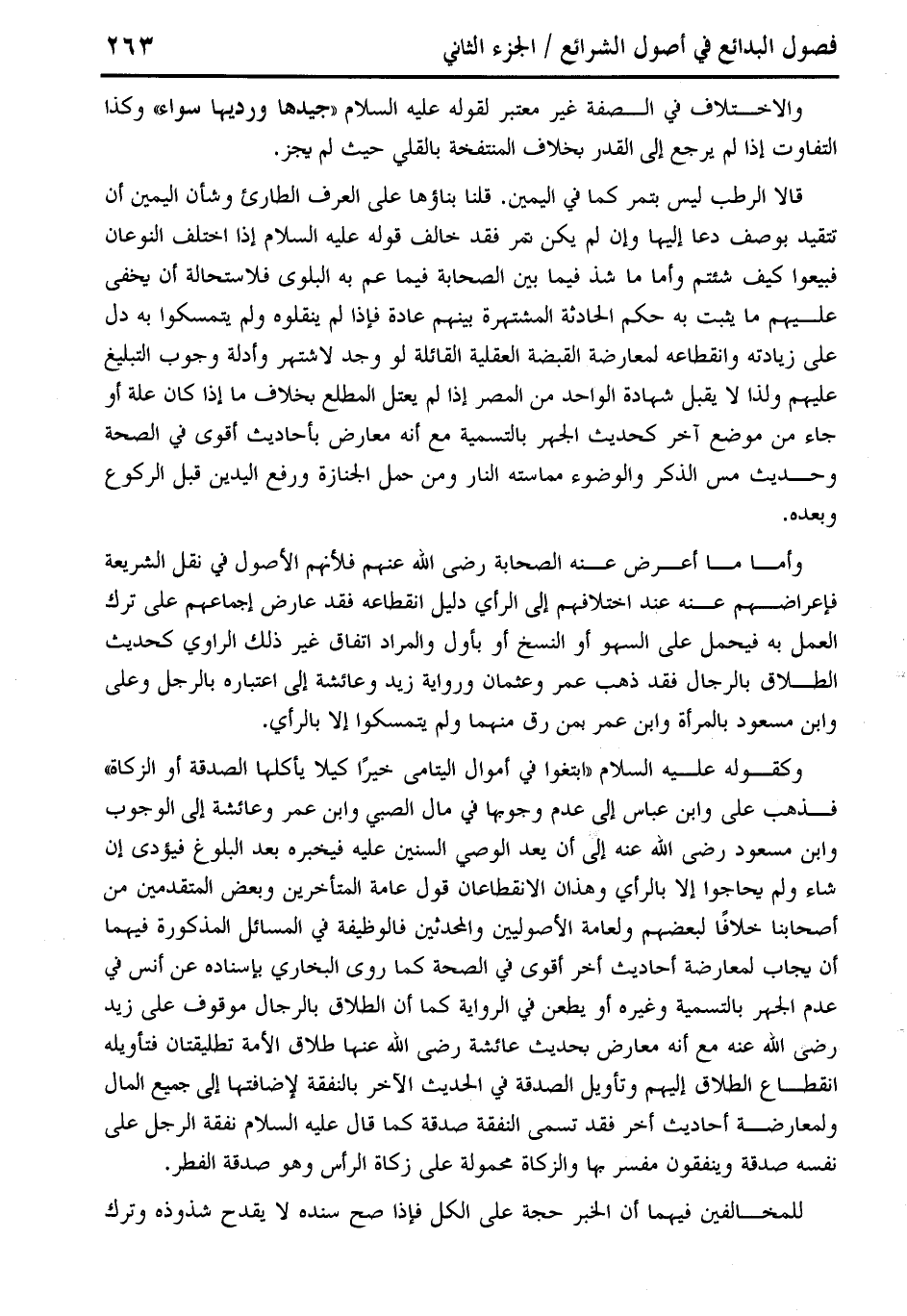 وكقوله عليه السلام "ابتغوا في أموال اليتامى خيرًا كيلا يأكلها الصدقة أو الزكاة" فذهب على وابن عباس إلى عدم وجوبها في مال الصبي وابن عمر وعائشة إلى الوجوب وابن مسعود رضي الله عنه إلى أن يعد الوصي السنين عليه فيخبره بعد البلوغ فيؤدى إن شاء ولم يحاجوا إلا بالرأي وهذان الانقطاعان قول عامة المتأخرين وبعض المتقدمين من أصحابنا خلافًا لبعضهم ولعامة الأصولين والمحدثين فالوظيفة في المسائل المذكورة فيهما أن يجاب لمعارضة أحاديث أخر أقوى في الصحة كما روى البخاري بإسناده عن أنس في عدم الجهر بالتسمية وغيره أو يطعن في الرواية كما أن الطلاق بالرجال موقوف على زيد رضى الله عنه مع أنه معارض بحديث عائشة رضي الله عنها طلاق الأمة تطليقتان فتأويله انقطاع الطلاق إليهم وتأويل الصدقة في الحديث الآخر بالنفقة لإضافتها إلى جميع المال ولمعارضة أحاديث أخر فقد تسمى النفقة صدقة كما قال عليه السلام نفقة الرجل على نفسه صدقة وينفقون مفسر بها والزكاة محمولة على زكاة الرأس وهو صدقة الفطر.