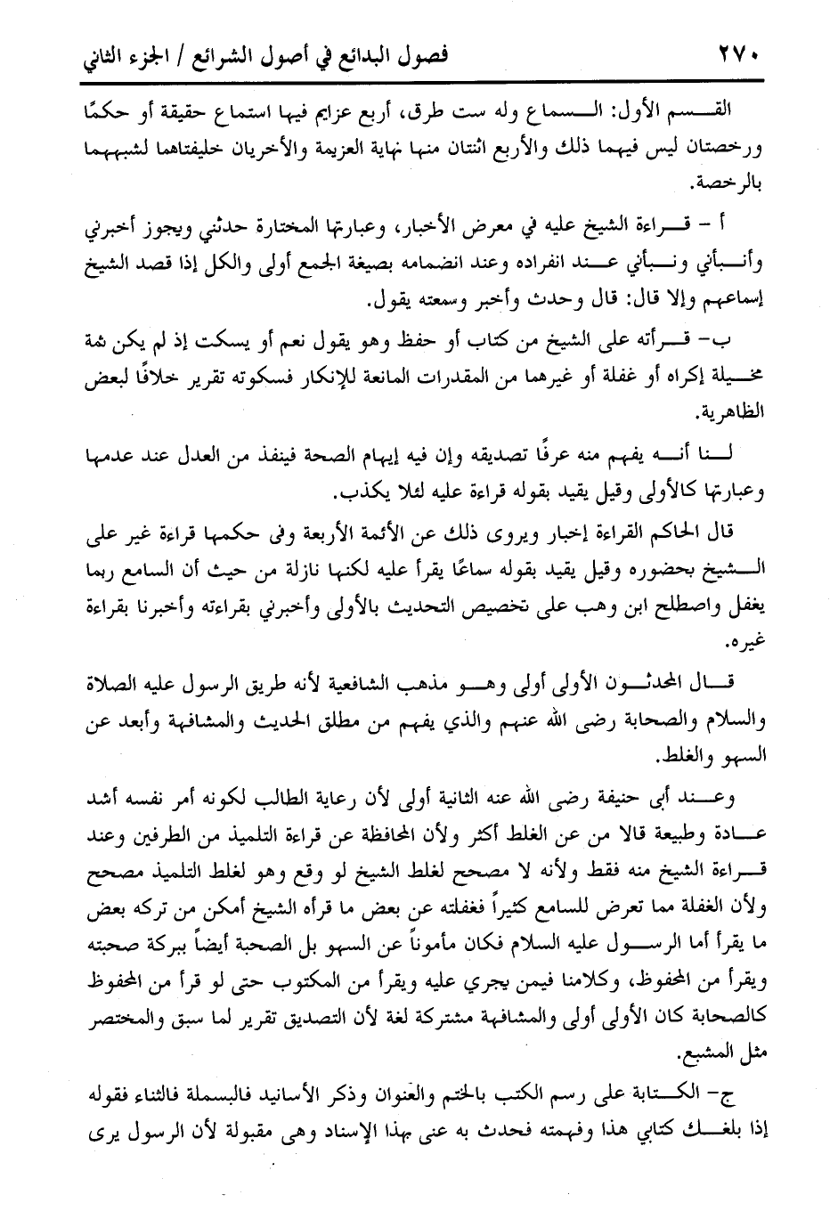 وعند أبى حنيفة رضي الله عنه الثانية أولى لأن رعاية الطالب لكونه أمر نفسه أشد عادة وطبيعة قالا من عن الغلط أكثر ولأن المحافظة عن قراءة التلميذ من الطرفين وعند قراءة الشيخ منه فقط ولأنه لا مصحح لغلظ الشيخ لو وقع وهو لغلظ التلميذ مصحح ولأن الغفلة مما تعرض للسامع كثيرًا فغفلته عن بعض ما قرأه الشيخ أمكن من تركه بعض ما يقرأ أما الرسول عليه السلام فكان مأمونًا عن السهو بل الصحبة أيضًا ببركة صحبته ويقرأ من المحفوظ، وكلامنا فيمن يجري عليه ويقرأ من المكتوب حتى لو قرأ من المحفوظ كالصحابة كان الأولى أولى والمشافهة مشتركة لغة لأن التصديق تقرير لما سبق والمختصر مثل المشبع.