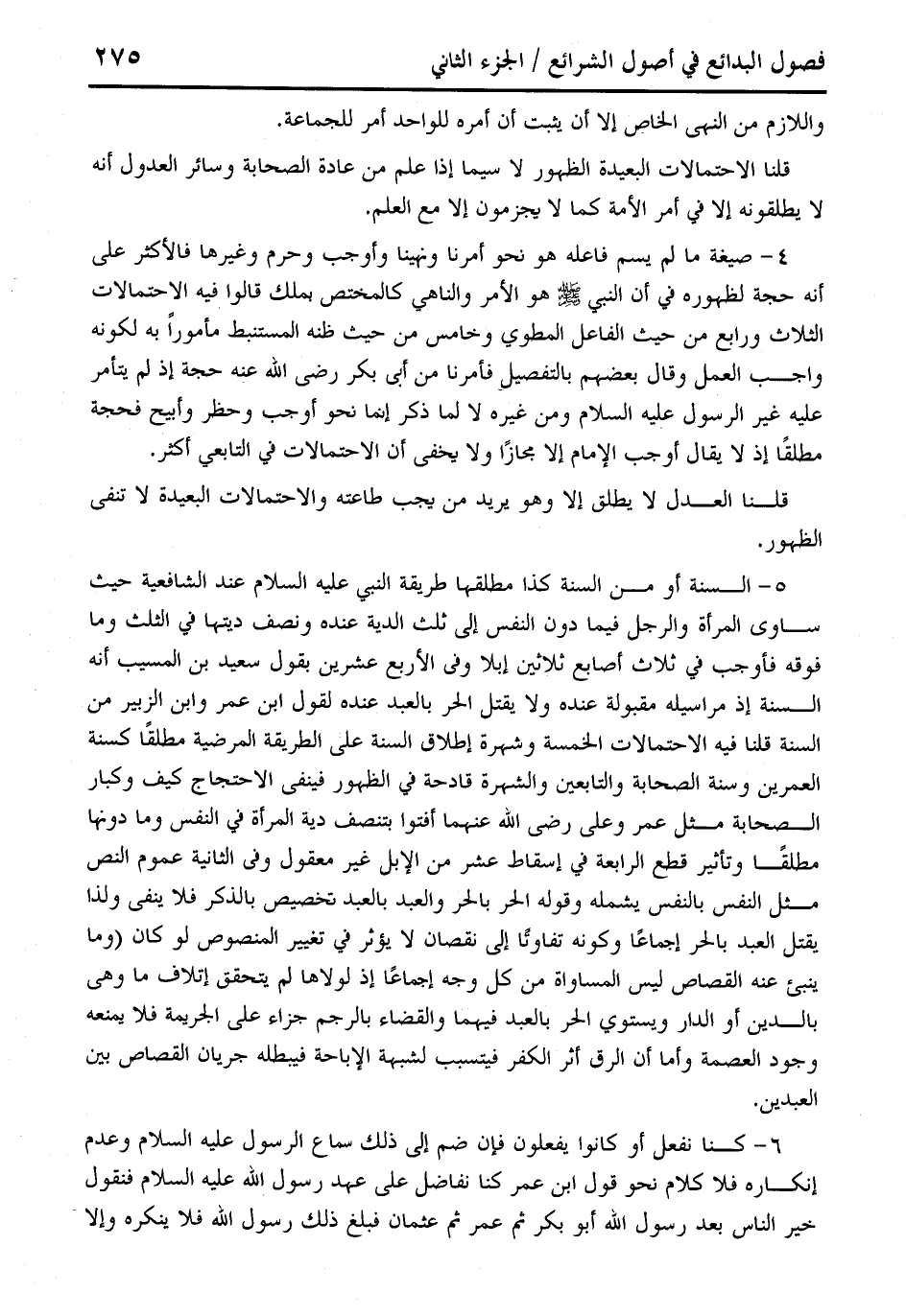 5 - السنة أو من السنة كذا مطلقها طريقة النبي عليه السلام عند الشافعية حيث ساوى المرأة والرجل فيما دون النفس إلى ثلث الدية عنده ونصف ديتها في الثلث وما فوقه فأوجب في ثلاث أصابع ثلاثين إبلا وفي الأربع عشرين بقول سعيد بن المسيب أنه السنة إذ مراسيله مقبولة عنده ولا يقتل الحر بالعبد عنده لقول ابن عمر وابن الزبير من السنة قلنا فيه الاحتمالات الخمسة وشهرة إطلاق السنة على الطريقة المرضية مطلقًا كسنة العمرين وسنة الصحابة والتابعين والشهرة قادحة في الظهور فينفى الاحتجاج كيف وكبار الصحابة مثل عمر وعلى رضي الله عنهما أفتوا بتنصف دية المرأة في النفس وما دونها مطلقًا وتأثير قطع الرابعة في إسقاط عشر من الإبل غير معقول وفي الثانية عموم النص مثل النفس بالنفس يشمله وقوله الحر بالحر والعبد بالعبد تخصيص بالذكر فلا ينفى ولذا يقتل العبد بالحر إجماعًا وكونه تفاوتًا إلى نقصان لا يؤثر في تغيير المنصوص لو كان (وما ينبئ عنه القصاص ليس المساواة من كل وجه إجماعًا إذ لولاها لم يتحقق إتلاف ما وهي بالدين أو الدار ويستوي الحر بالعبد فيهما والقضاء بالرجم جزاء على الجريمة فلا يمنعه وجود العصمة وأما أن الرق أثر الكفر فيتسبب لشبهة الإباحة فيبطله جريان القصاص بين العبدين.
