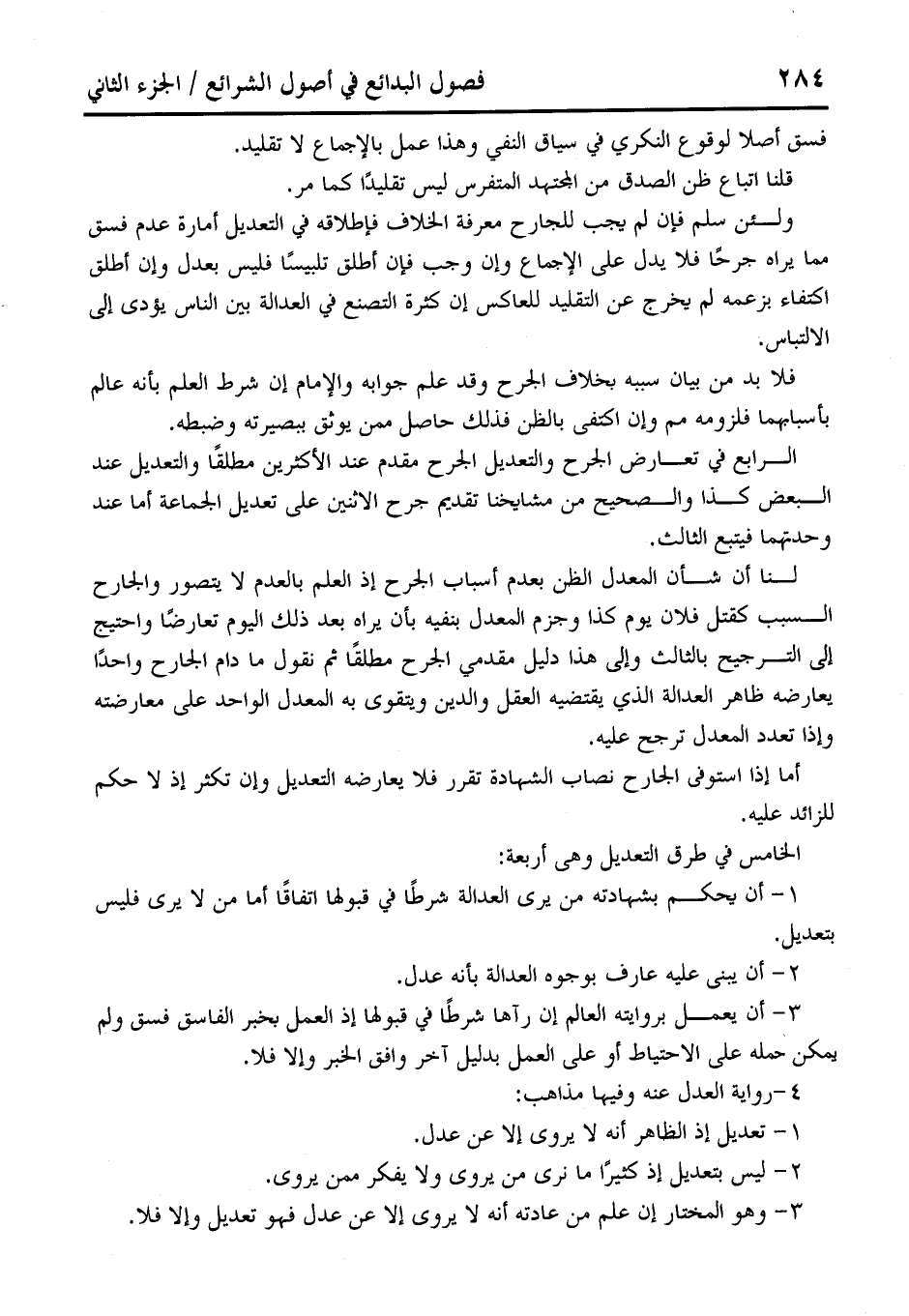 ولئن سلم فإن لم يجب للجارح معرفة الخلاف فإطلاقه في التعديل أمارة عدم فسق مما يراه جرحًا فلا يدل على الإجماع وإن وجب فإن أطلق تلبيسًا فليس بعدل وإن أطلق اكتفاء بزعمه لم يخرج عن التقليد للعاكس إن كثرة التصنع في العدالة بين الناس يؤدى إلى الالتباس.