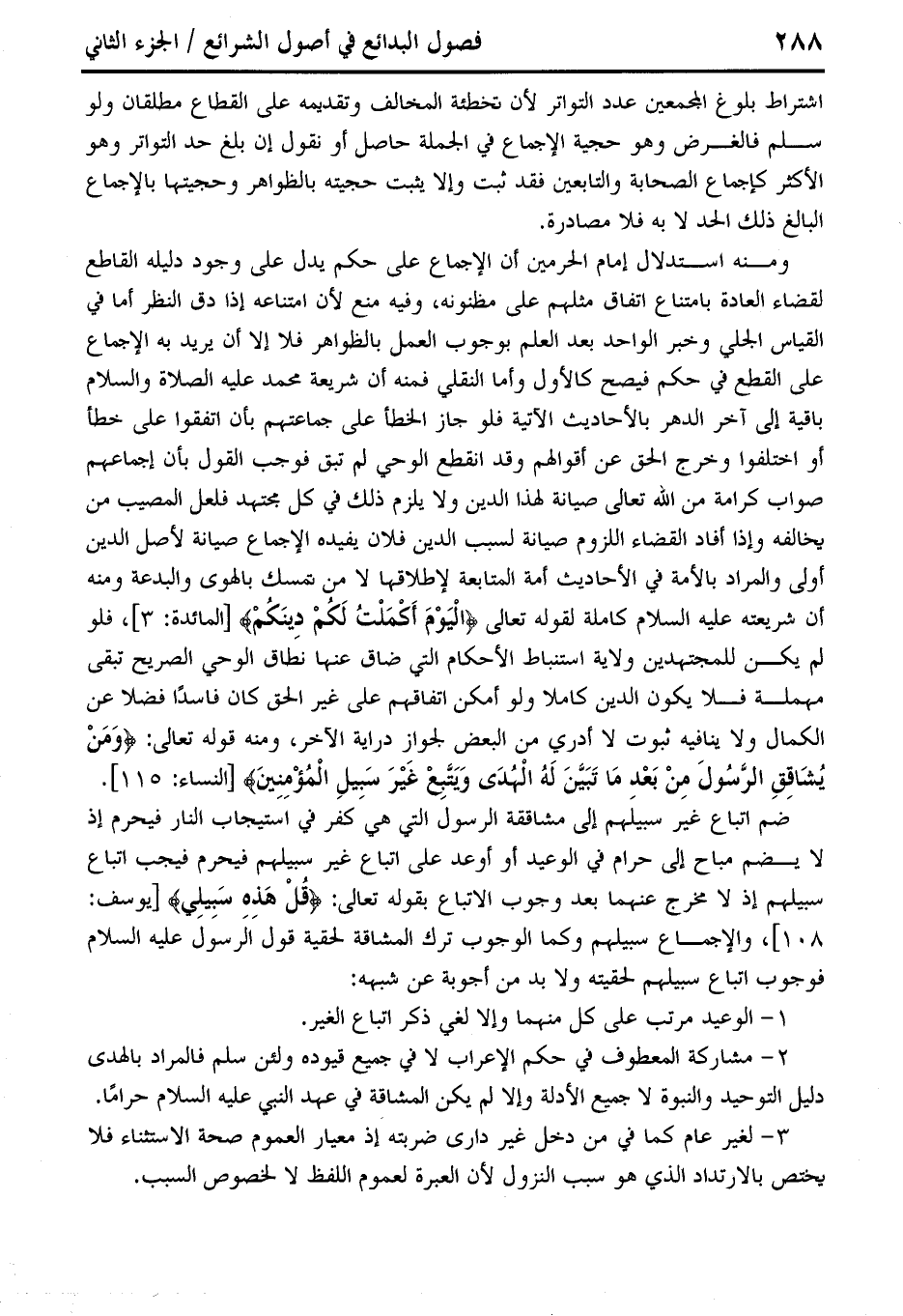 ضم اتباع غير سبيلهم إلى مشاققة الرسول التي هي كفر في استيجاب النار فيحرم إذ لا يضم مباح إلى حرام في الوعيد أو أوعد على اتباع غير سبيلهم فيحرم فيجب اتباع سبيلهم إذ لا مخرج عنهما بعد وجوب الاتباع بقوله تعالى: {قُلْ هَذِهِ سَبِيلِي} [يوسف: 108]، والإجماع سبيلهم وكما الوجوب ترك المشاقة لحقيتة قول الَرسول عليه السلام فوجوب اتباع سبيلهم لحقيته ولا بد من أجوبة عن شبهه: