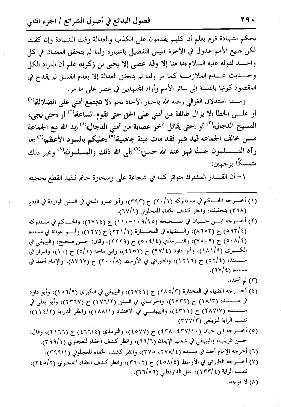 ومنه استدلال الغزالي رحمه الله بأخبار الآحاد نحوا لا لختمع أمتي على الضلالة (¬1) أو على الخطأ "لا يزال طائفة من أمتي على الحق حتى تقوم الساعه (¬2) أو "حتى يجىء المسيح الدجال" (¬3) أو "حتى يقاتل آخر عصابة من أمتي الدجال" (¬4) "يد الله مع الجماعة من خالف الجماعة قيد شبر فقد مات ميتة جاهلية" (¬5) "عليكم بالسود الأعظم" (¬6) "ما رآه المسلمون حسنًا فهو عند الله حسن" (¬7) "أبى الله ذلك والمسلمون" (¬8) وغير ذلك متمسكًا بوجهين: