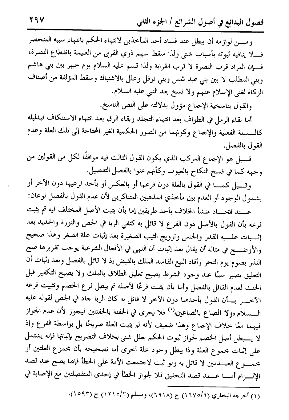 ومن لوازمه أن يبطل عند فساد أحد المأخذين لانتهاء الحكم بالتهاء سببه المنحصر فلا ينافيه ثبوته بأسباب شتى ولذا سقط سهم ذوي القربى من الغنيمة بانقطاع النصرة، فإن المراد قرب النصرة لا قرب القرابة ولذا قسم عليه السلام يوم خيبر بين بني هاشم وبنط المطلب لا بين بني عبد شمس وبنى نوفل وعلل بالاشتباك وسقط المؤلفة من أصناف الزكاة لغنى الإِسلام عنهم ولا نسخ بعد النبي عليه السلام.