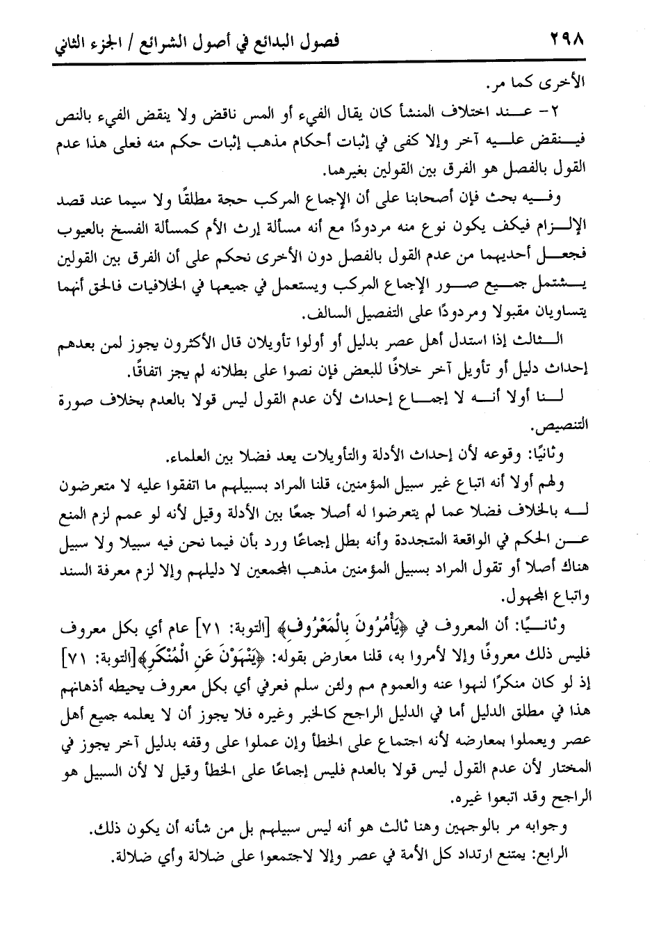 وثانيًا: أن المعروف في {يَأْمُرُونَ بِالْمَعْرُوفِ} [التوبة: 71] عام أي بكل معروف فليس ذلك معروفًا وإلا لأمروا به، قلنا معارض بقوله: {وَيَنْهَوْنَ عَنِ الْمُنْكَر} [التوبة: 71] إذ لو كان منكرًا لنهوا عنه والعموم مم ولئن سلم فعرفي أي بكل معروف يحيطه أذهانهم هذا في مطلق الدليل أما في الدليل الراجح كالخبر وغيره فلا يجوز أن لا يعلمه جميع أهل عصر ويعملوا بمعارضه لأنه اجتماع على الخطأ وإن عملوا على وقفه بدليل آخر يجوز في المختار لأن عدم القول ليس قولًا بالعلم فليس إجماعًا على الخطأ وقيل لا لأن السبيل هو الراجح وقد اتبعوا غيره.