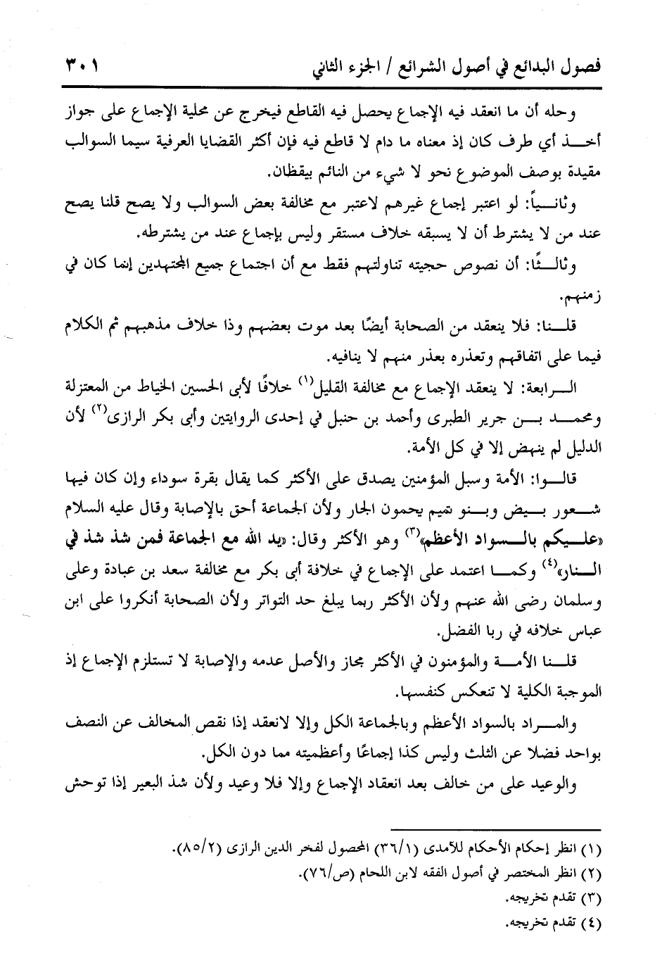 قالوا: الأمة وسبل المؤمنين يصدق على الأكثر كما يقال بقرة سوداء وإن كان فيها شعور بيض وبنو تميم يحمون الجار ولأن الجماعة أحق بالإصابة وقال عليه السلام "عليكم بالسواد الأعظم" (¬3) وهو الأكثر وقال: "يد الله مع الجماعة فمن شذ شذ في النار" (¬4) وكما اعتمد على الإجماع في خلافة أبى بكر مع مخالفة سعد بن عبادة وعلى وسلمان رضي الله عنهم ولأن الأكثر ربما يبلغ حد التواتر ولأن الصحابة أنكروا على ابن عباس خلافه في ربا الفضل.