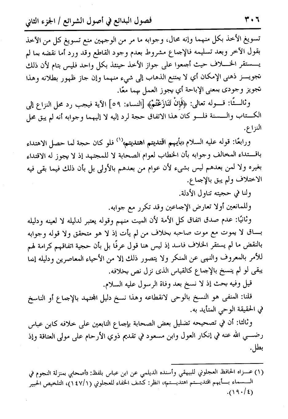 قلنا: المنفى هو النسخ بالوحى لانقطاعه وهذا نسخ دليل المجتهد بالإجماع أو الناسخ في الحقيقة الوحي المتأيد به، وثالثا: أن في تصحيحه تضليل بعض الصحابة بإجماع التابعين على خلافه كابن عباس رضي الله عنه في إنكار العول وابن مسعود في تقديم ذوي الأرحام على مولى العتاقة وإذ بطل.