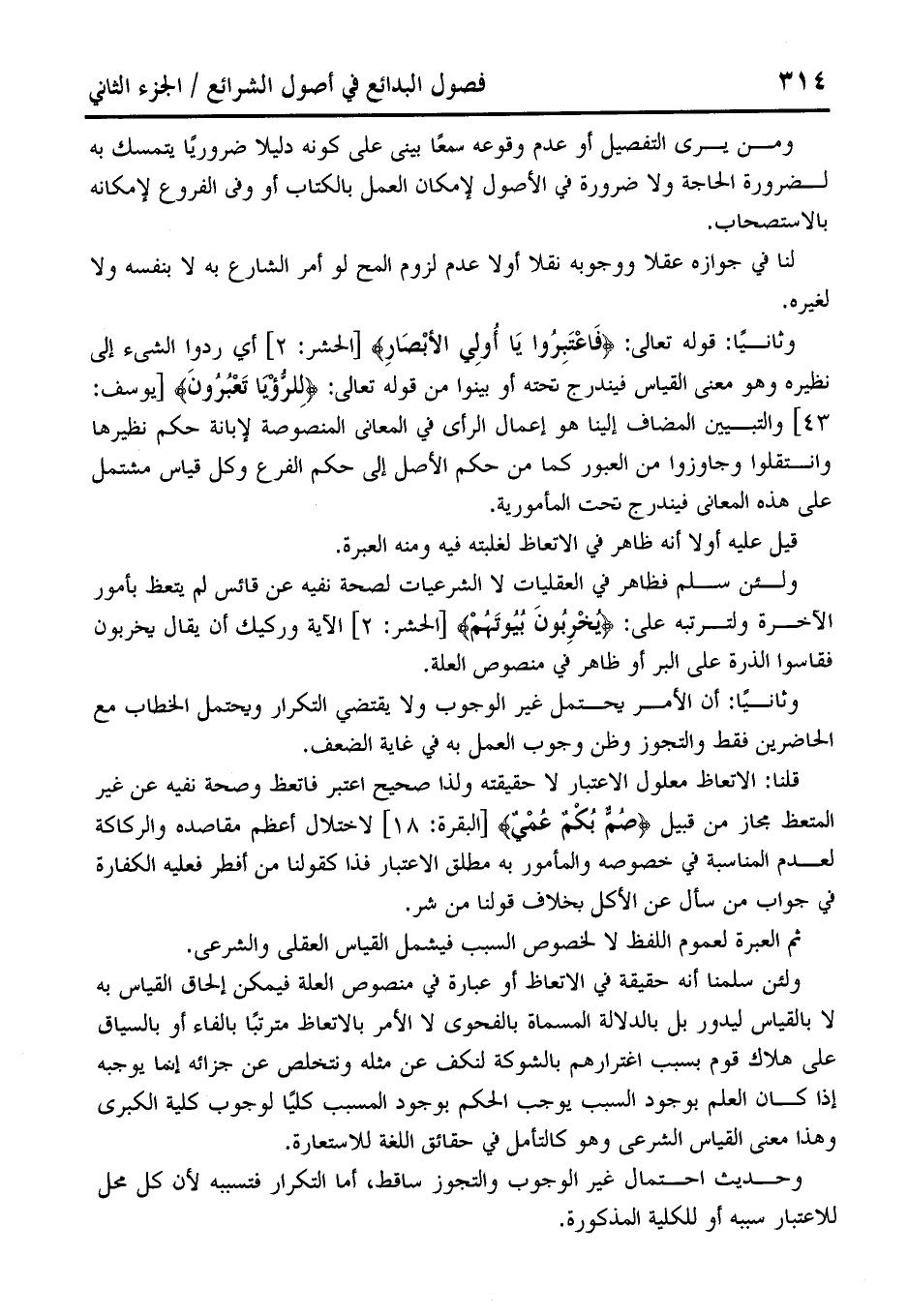 وثانيًا: قوله تعالى: {فَاعْتَبِرُوا يَا أُولِي الْأَبْصَارِ} [الحشر: 2] أي ردوا الشىء إلى نظيره وهو معنى القياس فيندرج لخته أو بينوا من قوله تعالى: {لِلرُّؤْيَا تَعْبُرُونَ} [يوسف: 43] والتبين المضاف إلينا هو إعمال الرأى في المعالى المنصَوصة لإبانة حكم نظيرها وانتقلوا وجاوزوا من العبور كما من حكم الأصل إلى حكم الفرع وكل قياس مشتمل على هذه المعالى فيندرج تحت المأمورية.