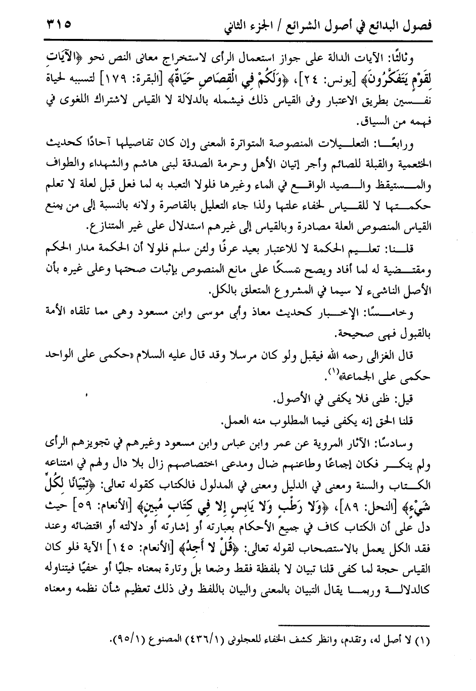 وسادسًا: الآثار المروية عن عمر وابن عباس وابن مسعود وغيرهم في تخويزهم الرأى ولم ينكر فكان إجماعًا وطاعنهم ضال ومدعى اختصاصهم زال بلا قال ولهم في امتناعه الكتاب والسنة ومعنى في الدليل ومعنى في المدلول فالكتاب كقوله تعالى: {تِبْيَانًا لِكُلِّ شَيْءٍ} [النحل: 89]، {وَلَا رَطْبٍ وَلَا يَابِسٍ إِلَّا فِي كِتَابٍ مُبِينٍ} [الأنعام: 59] حيث دل على أن الكتاب كاف في جميع الأحكام بعبارته أو إشارته أو دلالته أو اقتضائه وعند فقد الكل يعمل بالاستصحاب لقوله تعالى: {قُلْ لَا أَجِدُ} [الأنعام: 145] الآية فلو كان القياس حجة لما كفى قلنا تبيان لا بلفظة فقط وضعا بل وتارة بمعناه جليًا أو خفيًا فيتناوله كالدلالة وربما يقال التبيان بالمعنى والبيان باللفظ وفي ذلك تعطم شأن نظمه ومعناه