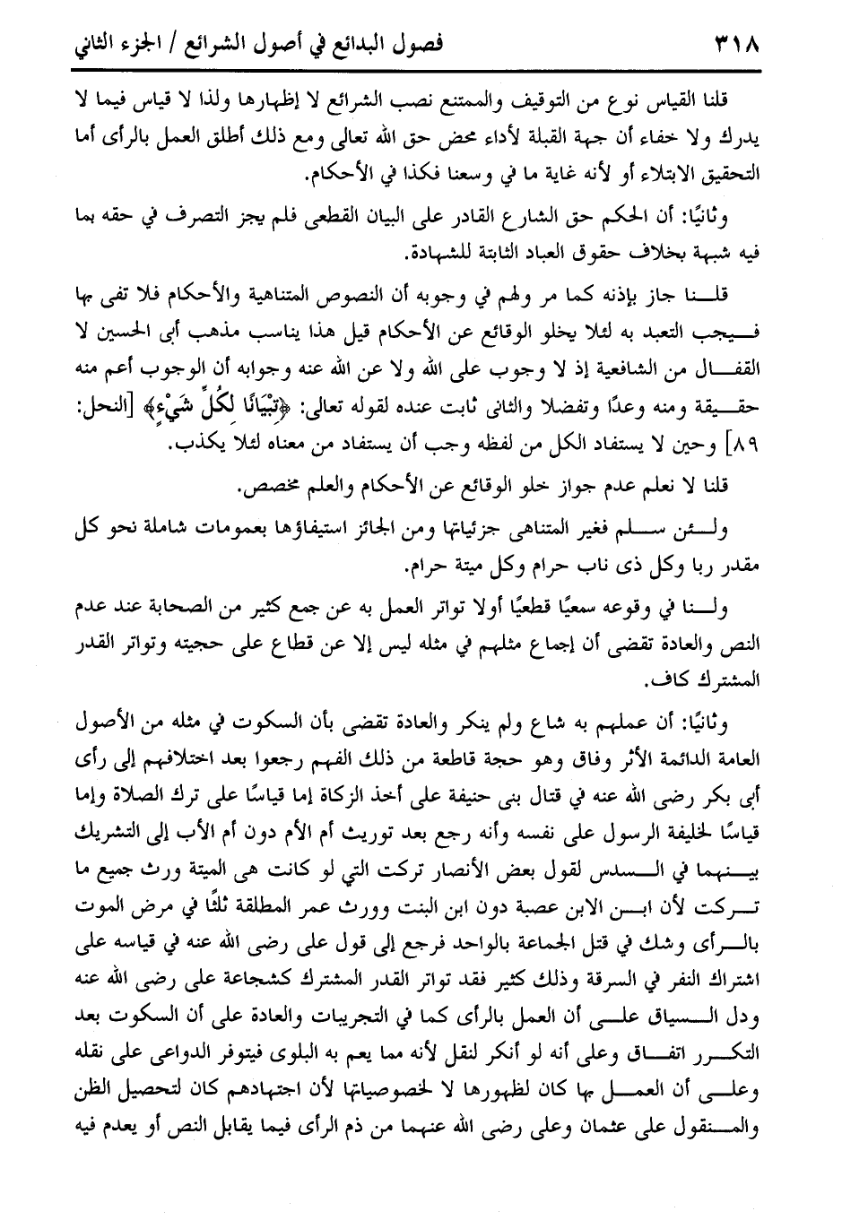 وثانيًا: أن عملهم به شاع ولم ينكر والعادة تقضى بأن السكوت في مثله من الأصول العامة الدائمة الأثر وفاق وهو حجة قاطعة من ذلك اللهم رجعوا بعد اختلافهم إلى رأى أبى بكر رضي الله عنه في قتال بني حنيفة على أخذ الزكاة إما قياسًا على ترك الصلاة وإما قياسًا لخليفة الرسول على نفسه وأنه رجع بعد توريث أم الأم دون أم الأب إلى التشريك بينهما في السدس لقول بعض الأنصار تركت التي لو كانت هى الميتة ورث جميع ما تركت لأن ابن الابن عصبة دون ابن البنت وورث عمر المطلقة ثلثًا في مرض الموت بالرأى وشك في قتل الجماعة بالواحد فرجع إلى قول على رضي الله عنه في قياسه على اشتراك النفر في السرقة وذلك كثير فقد تواتر القدر المشترك كشجاعة على رضي الله عنه ودل السياق على أن العمل بالرأى كما في التجريبات والعادة على أن السكوت بعد التكرر اتفاق وعلى أنه لو أنكر لنقل لأنه مما يعم به البلوى فيتوفر الدواعى على نقله وعلى أن العمل بها كان لظهورها لا لخصوصياتها لأن اجتهادهم كان لتحصيل الظن والمنقول على عثمان وعلى رضي الله عنهما من ذم الرأى فيما يقابل النص أو يعدم فيه