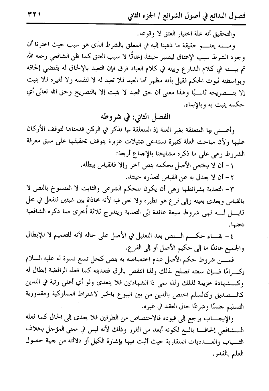 وأعنى بها المتعلقة بغير العلة إذ المتعلقة بها تذكر في الركن قدمناها لتوقف الأركان عليها ولأن مباحث العلة كثيرة تستدعى تمثيلات غزيرة يتوقف لخقيقها على سبق معرفة الشروط وهي على ما ذكره مشايخنا بالإجماع أربعة: