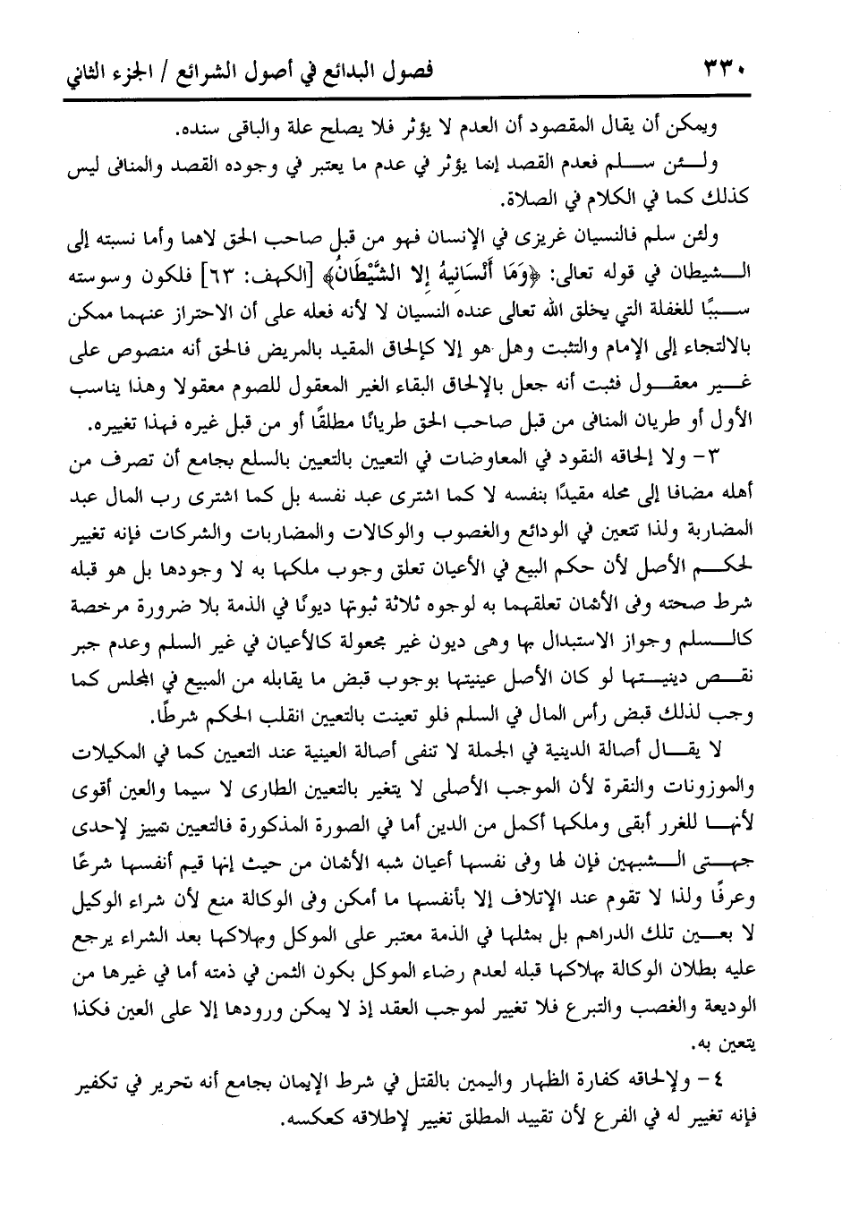 ولئن سلم فالنسيان غريزى في الإنسان فهو من قبل صاحب الحق لاهما وأما نسبته إلى الشيطان في قوله تعالى: {وَمَا أَنْسَانِيهُ إِلَّا الشَّيْطَانُ} [الكهف: 63] فلكون وسوسته سببًا للغفلة التي يخلق الله تعالى عنده النسيان لا لأنه فعله على أن الاحتراز عنهما ممكن بالالتجاء إلى الإِمام والتثبت وهل. هو إلا كإلحاق المقيد بالمريض فالحق أنه منصوص على غير معقول فثبت أنه جعل بالإلحاق البقاء الغير المعقول للصوم معقولا وهذا يناسب الأول أو طريان المنافي من قبل صاحب الحق طريانًا مطلقًا أو من قبل غيره فهذا تغييره.