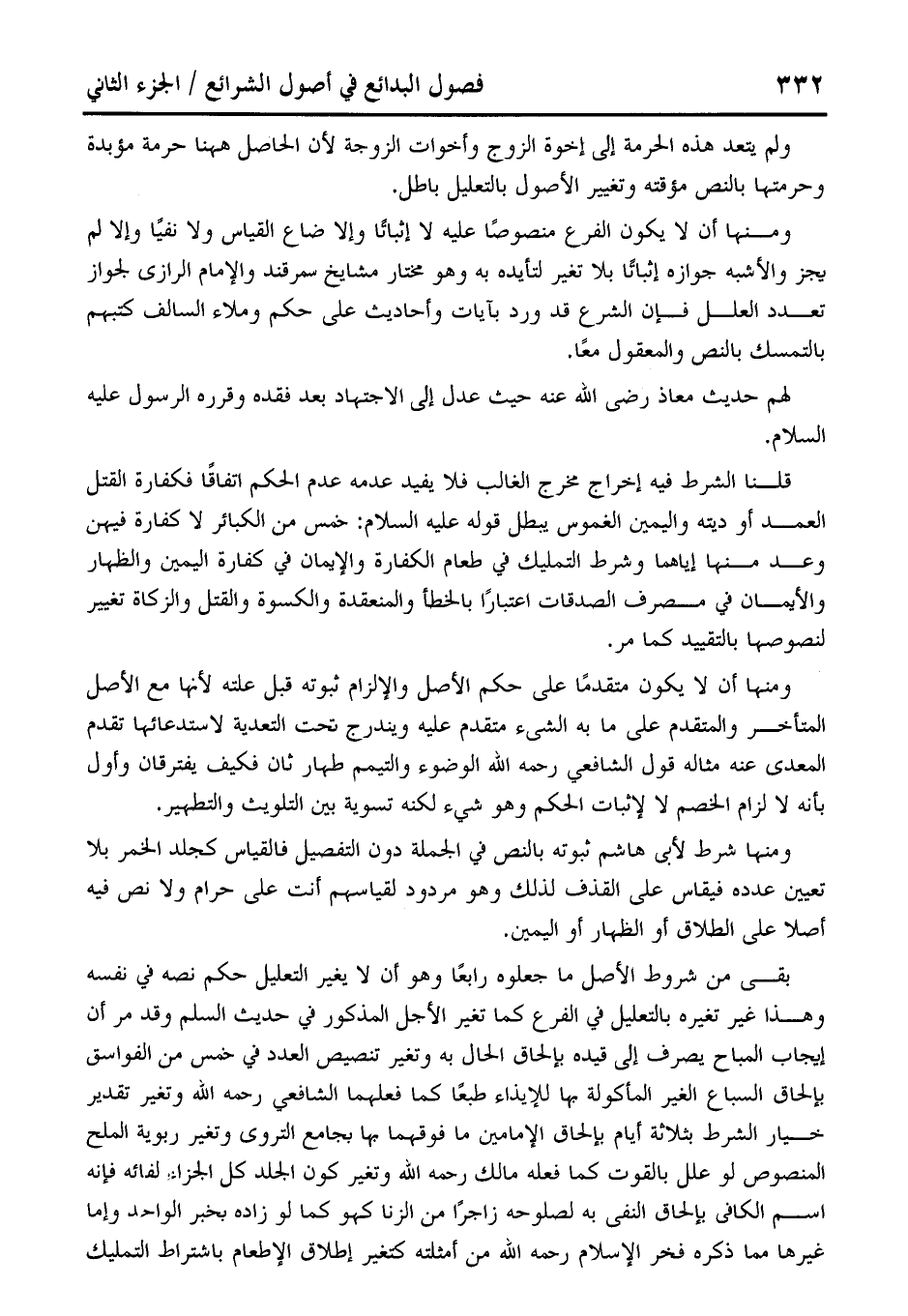 بقى من شروط الأصل ما جعلوه رابعًا وهو أن لا يغير التعليل حكم نصه في نفسه وهذا غير تغيره بالتعليل في الفرع كما تغير الأجل المذكور في حديث السلم وقد مر أن إيجاب المباح يصرف إلى قيده بإلحاق الحال به وتغير تنصيص العدد في خمس من الفواسق بإلحاق السباع الغير المأكولة بها للإيذاء طبعًا كما فعلهما الشافعي رحمه الله وتغير تقدير خيار الشرط بثلاثة أيام بإلحاق الإمامين ما فوقهما بها بجامع التروى وتغير ربوية الملح المنصوص لو علل بالقوت كما فعله مالك رحمه الله وتغيركون الجلد كل الجزاء لفائه فإنه اسم الكافي بإلحاق النفى به لصلوحه زاجرًا من الزنا كهو كما لو زاده بخبر الواحد وإما غيرها مما ذكره فخر الإِسلام رحمه الله من أمثلته كتغير إطلاق الإطعام باشتراط التمليك