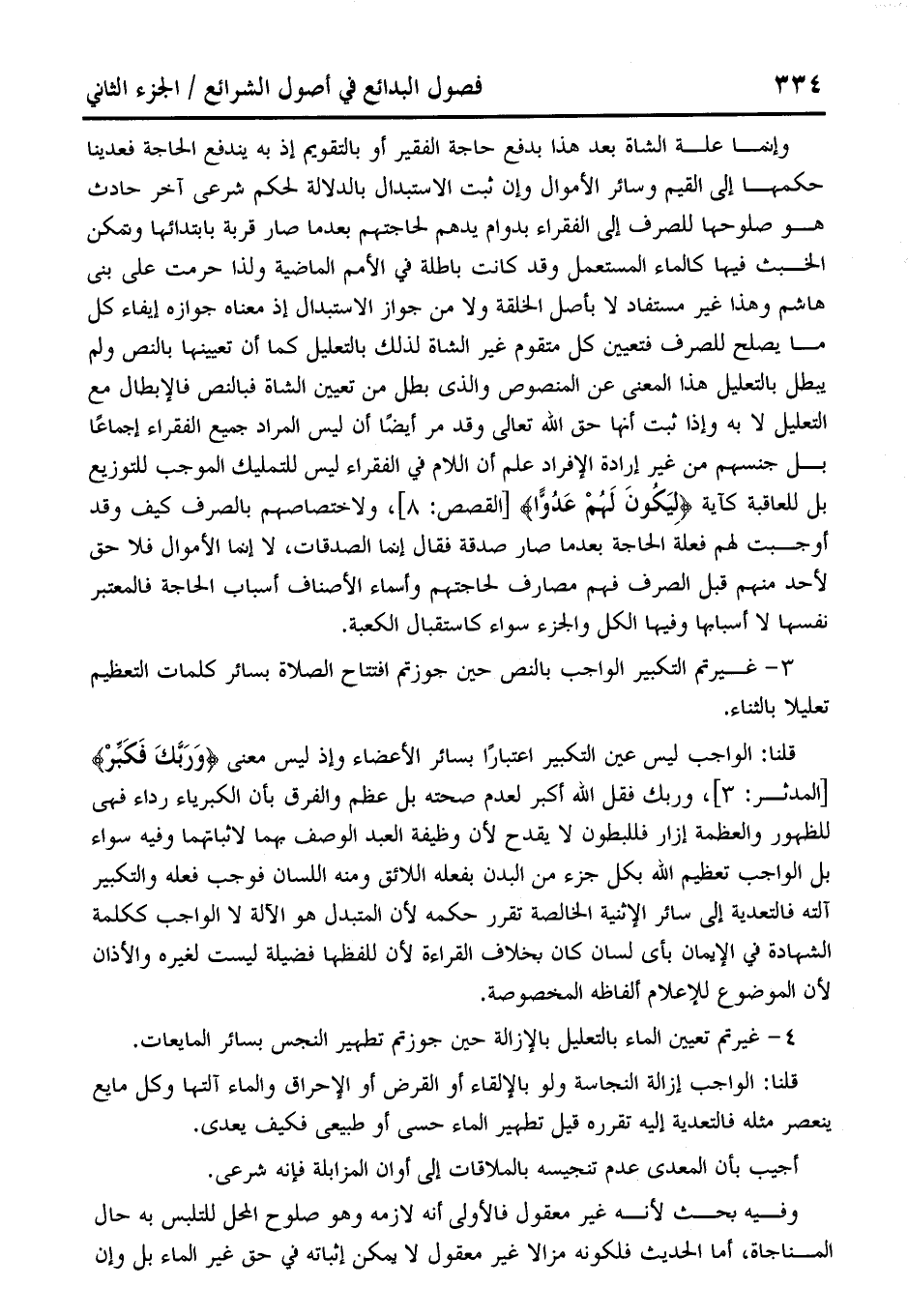 وإنما علة الشاة بعد هذا بدفع حاجة الفقير أو بالتقويم إذ به يندفع الحاجة فعدينا حكمها إلى القيم وسائر الأموال وإن ثبت الاستبدال بالدلالة لحكم شرعي آخر حادث هو صلوحها للصرف إلى الفقراء بدوام يدهم لحاجتهم بعد ما صار قربة بابتدائها وتمكن الخبث فيها كالماء المستعمل وقدكانت باطلة في الأمم الماضية ولذا حرمت على بني هاشم وهذا غير مستفاد لا بأصل الخلقة ولا من جواز الاستبدال إذ معناه جوازه إيفاء كل ما يصلح للصرف فتعيين كل متقوم غير الشاة لذلك بالتعليل كما أن تعيينها بالنص ولم يبطل بالتعليل هذا المعنى عن المنصوص والذي بطل من تعيين الشاة فبالنص فالإبطال مع التعليل لا به وإذا ثبت أنها حق الله تعالى وقد مر أيضًا أن ليس المراد جميع الفقراء إجماعًا بل جنسهم من غير إرادة الإفراد علم أن اللام في الفقراء ليس للتمليك الموجب للتوزيع بل للعاقبة كآية {لِيَكُونَ لَهُمْ عَدُوًّا} [القصص: 8]، ولاختصاصهم بالصرف كيف وقد أوجبت لهم فعلة الحاجة بعد ما صار صدقة فقال إنما الصدقات، لا إنما الأموال فلا حق لأحد منهم قبل الصرف فهم مصارف لحاجتهم وأسماء الأصناف أسباب الحاجة فالمعتبر نفسها لا أسبابها وفيها الكل والجزء سواءكاستقبال الكعبة.