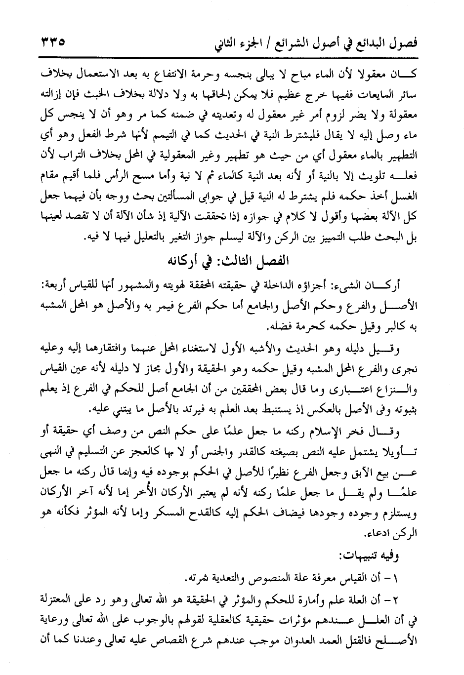وقال فخر الإِسلام ركنه ما جعل علمًا على حكم النص من وصف أي حقيقة أو تأويلا يشتمل عليه النص بصيغته كالقدر والجنس أو لا بها كالعجز عن التسليم في النهي عن بيع الآبق وجعل الفرع نظيرًا للأصل في الحكم بوجوده فيه وإنما قال ركنه ما جعل علمًا ولم يقل ما جعل علمًا ركنه لأنه لم يعتبر الأركان الأُخر إما لأنه آخر الأركان ويستلزم وجوده وجودها فيضاف الحكم إليه كالقدح المسكر وإما لأنه المؤثر فكأنه هو الركن ادعاء.