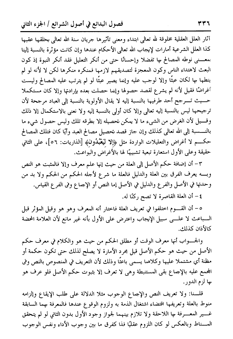 آثار العلل العقلية مخلوقة لله تعالى ابتداء ومعنى تأثيرها جريان سنة الله تعالى بخلقها عقبها كذا العلل الشرعية أمارات لإيجاب الله تعالى الأحكام عندها وإن كانت مؤثرة بالنسبة إلينا بمعنى نوطه المصالح بها تفضلا وإحسانًُا حتى من أنكر التعليل فقد أنكر النبوة إذ كون البعث لاهتداء الناس وكون المعجزة لتصديقهم لازمها فمنكره منكرها لكن لا لأنه لو لم، ينطها بها لكان عبثًا وإلا لوجب عليه وإنما يصير عبثًا لو لم يترتب عليه المصالح وليست أغراضًا فقيل لأنه لم يشرع لقصد حصولها وإنما حصلت بعده بإرادتها وإلا كان مستكملا ححيث ترجح أحد طرفيها بالنسبة إليه لا يقال الأولوية بالنسبة إلى العباد مرجحة لأن ترجيحها ليس بالنسبة إليه تعالى وإلا كان أولى بالنسبة إليه ولا نعنى بالاستكمال إلا ذلك وقيل لأن الغرض من الشىء ما لا يمكن تحصيله إلا بطرقه تلك وليس حصول شيء ما بالنسبة إلى الله تعالى كذلك وإن جاز قصد تحصيل مصاع العبد وأيًا كان فتلك المصالح حكم لا أغراض والتعليلات الواردة مثل {إِلَّا لِيَعْبُدُونِ} [الذاريات: 56]، على الثاني حقيقة وعلى الأول استعارة تبعية تشبيهًا لها بالأغراض والبَواعث.