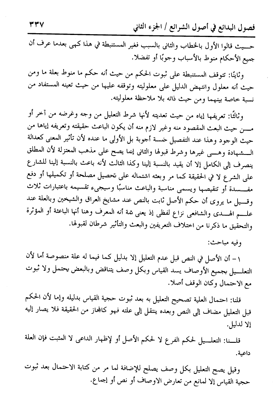 وثالثًا: تعريفها إياه من حيث تعديته لأنها شرط التعليل من وجه وغرضه من آخر أو من حيث البعث المقصود منه وغير لازم منه أن يكون الباعث حقيقته وتعريفه إياها من حيث الوجود وهذا عند التفصيل خمسة أجوبة بل الأولى ما عنده لأن تأثير المعنى كعدالة الشهادة وهي غيرها وشرط قبولها والثاني إنما يصح على مذهب المعتزلة لأن المطلق ينصرف إلى الكامل إلا أن يقيد بالنسبة إلينا وكذا الثالث لأنه باعث بالنسبة إلينا للشارع على الشرع لا في الحقيقة كما مر وبعثه اشتماله على تحصيل مصلحة أو تكميلها أو دفع مفسدة أو تنقيصها ويسمى مناسبة والباعث مناسبًا وسيجىء تقسيمه باعتبارات ثلاث وقيل ما يروى أن حكم الأصل ثابت بالنص عند مشايخ العراق والشيخين وبالعلة عند علم الهدى والشافعى نزاع لفظي إذ يعني ثمة أنه المعرف وهنا أنها الباعثة أو المؤثرة والتحقيق ما ذكرنا من اختلاف التعريفين والبعث والتأثير شرطان لقبولها.