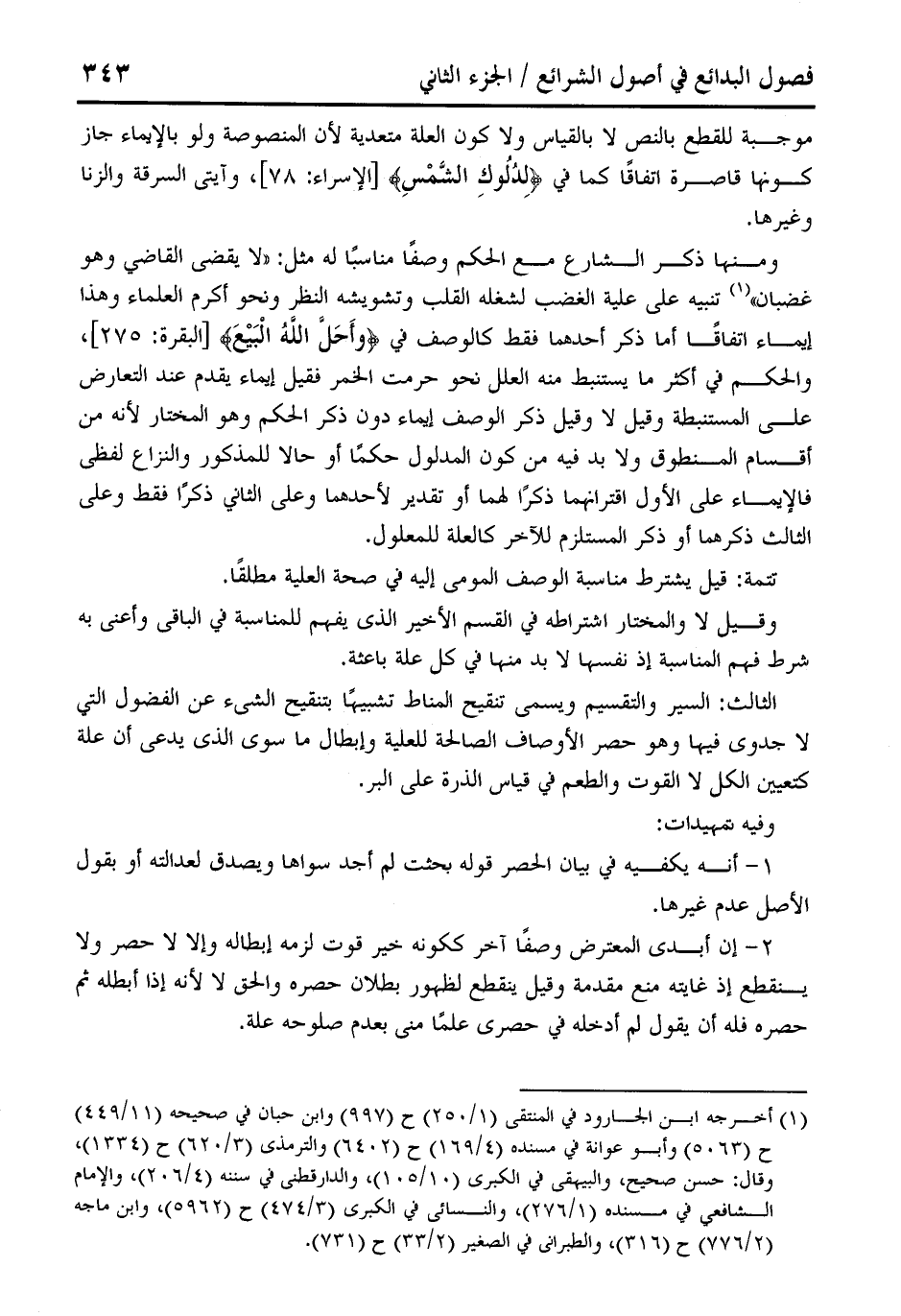 ومنها ذكر الشارع مع الحكم وصفًا مناسبًا له مثل: "لا يقضي القاضي وهو غضبان" (¬1) تنبيه على علية الغضب لشغله القلب وتشويشه النظر ونحو أكرم العلماء وهذا إيماء اتفاقًا أما ذكر أحدهما فقط كالوصف في {وَأَحَلَّ اللَّهُ الْبَيْعَ} [البقرة: 275] والحكم في أكثر ما يستبط منه العلل نحو حرمت الخمر فقيل إيماء يقدم عند التعارض