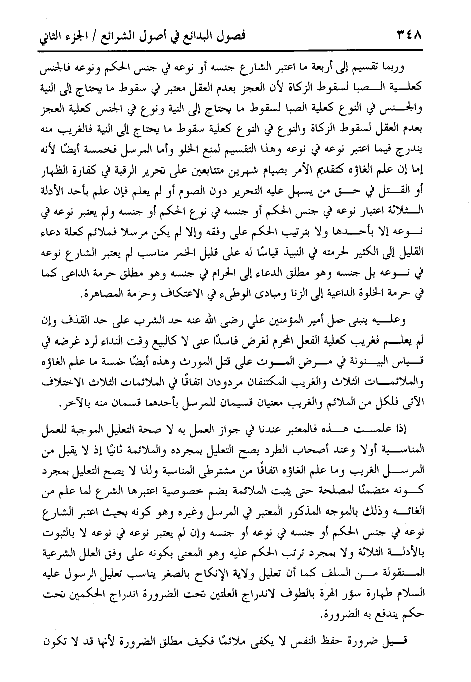 وربما تقسيم إلى أربعة ما اعتبر الشارع جنسه أو نوعه في جنس الحكم ونوعه فالجنس كعلية الصبا لسقوط الزكاة لأن العجز بعدم العقل معتبر في سقوط ما يحتاج إلى النية والجنس في النوع كعلية الصبا لسقوط ما يحتاج إلى النية ونوع في الجنس كعلية العجز بعدم العقل لسقوط الزكاة والنوع في النوع كعلية سقوط ما يحتاج إلى النية فالغريب منه يندرج فيما اعتبر نوعه في نوعه وهذا التقسيم لمنع الخلو وأما المرسل فخمسة أيضًا لأنه إما إن علم الغاؤه كتقديم الأمر بصيام شهرين متتابعين على تحرير الرقبة في كفارة الظهار أو القتل في حق من يسهل عليه التحرير دون الصوم أو لم يعلم فإن علم بأحد الأدلة الثلاثة اعتبار نوعه في جنس الحكم أو جنسه في نوع الحكم أو جنسه ولم يعتبر نوعه في نوعه إلا بأحدها ولا بترتيب الحكم على وفقه وإلا لم يكن مرسلًا فملائم كعلة دعاء القليل إلى الكثير لحرمته في النبيذ قياسًا له على قليل الخمر مناسب لم يعتبر الشارع نوعه في نوعه بل جنسه وهو مطلق الدعاء إلى الحرام في جنسه وهو مطلق حرمة الداعى كما في حرمة الخلوة الداعية إلى الزنا ومبادى الوطىء في الاعتكاف وحرمة المصاهرة.