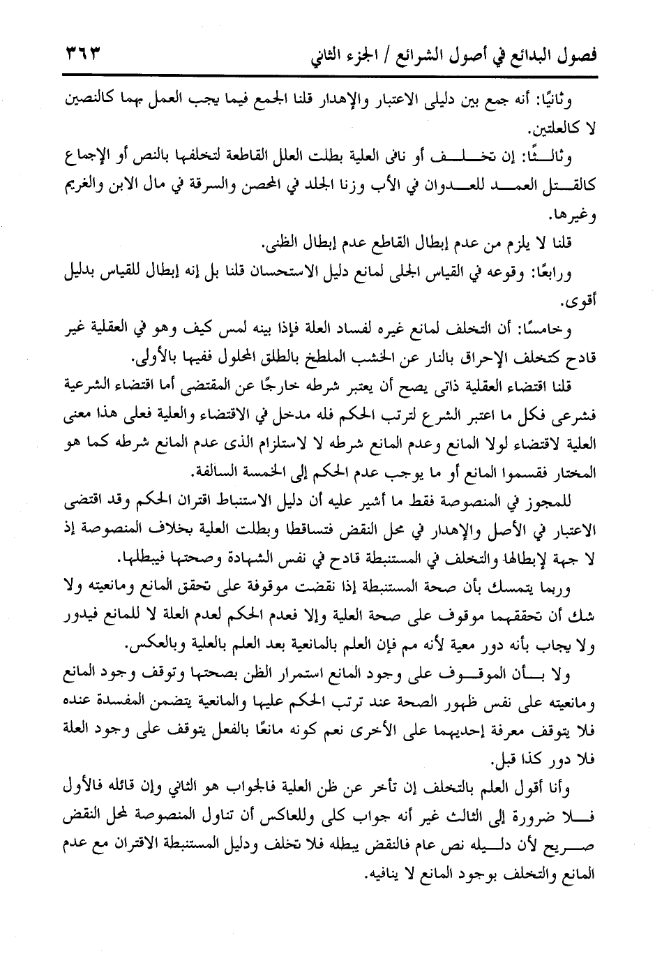 وثانيًا: أنه جمع بين دليلي الاعتبار والإهدار قلنا الجمع فيما يجب العمل بهما كالنصين لا كالعلتين. وثالثًا: إن تخلف أو نافي العلية بطلت العلل القاطعة لتخلفها بالنص أو الإجماع كالقتل العمد للعدوان في الأب وزنا الجلد في المحصن والسرقة في مال الابن والغريم وغيرها.