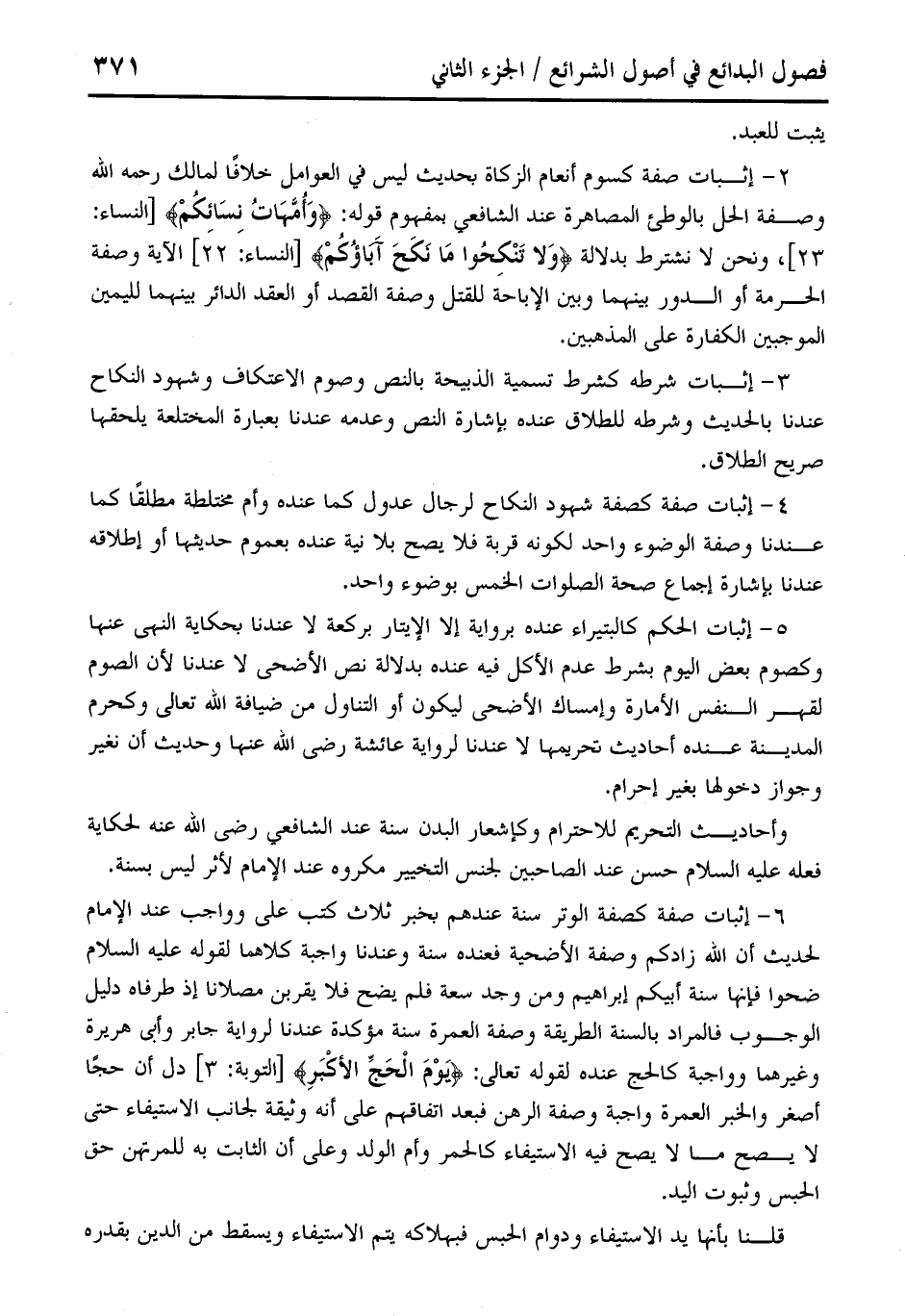 2 - إثبات صفة كسوم أنعام الزكاة بحديث ليس في العوامل خلافًا لمالك رحمه الله وصفة الحل بالوطئ المصاهرة عند الشافعي بمفهوم قوله: {وَأُمَّهَاتُ نِسَائِكُمْ} [النساء: 23]، ونحن لا نشترط بدلالة {وَلَا تَنْكِحُوا مَا نَكَحَ آبَاؤُكُمْ} [النساء: 22] الآية وصفة الحرمة أو الدور بينهما وبين الإباحة للقتل وصفة القصد أو العقد الدائر بينهما لليمين الموجبين الكفارة على المذهبين.