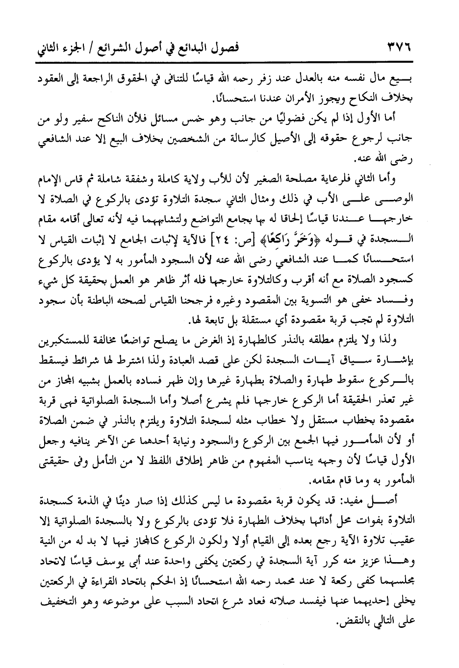 أصل مفيد: قد يكون قربة مقصودة ما ليس كذلك إذا صار دينًا في الذمة كسجدة التلاوة بفوات محل أدائها بخلاف الطهارة فلا تؤدى بالركوع ولا بالسجدة الصلواتية إلا عقيب تلاوة الآية رجع بعده إلى القيام أولا ولكون الركوع كالمجاز فيها لا بد له من النية وهذا عزيز منه كرر آية السجدة في ركعتين يكفى واحدة عند أبى يوسف قياسًا لاتحاد مجلسهما كفى ركعة لا عند محمَّد رحمه الله استحسانًا إذ الحكم باتحاد القراءة في الركعتين يخلى إحديهما عنها فيفسد صلاته فعاد شرع اتحاد السبب على موضوعه وهو التخفيف على التالى بالنقض.