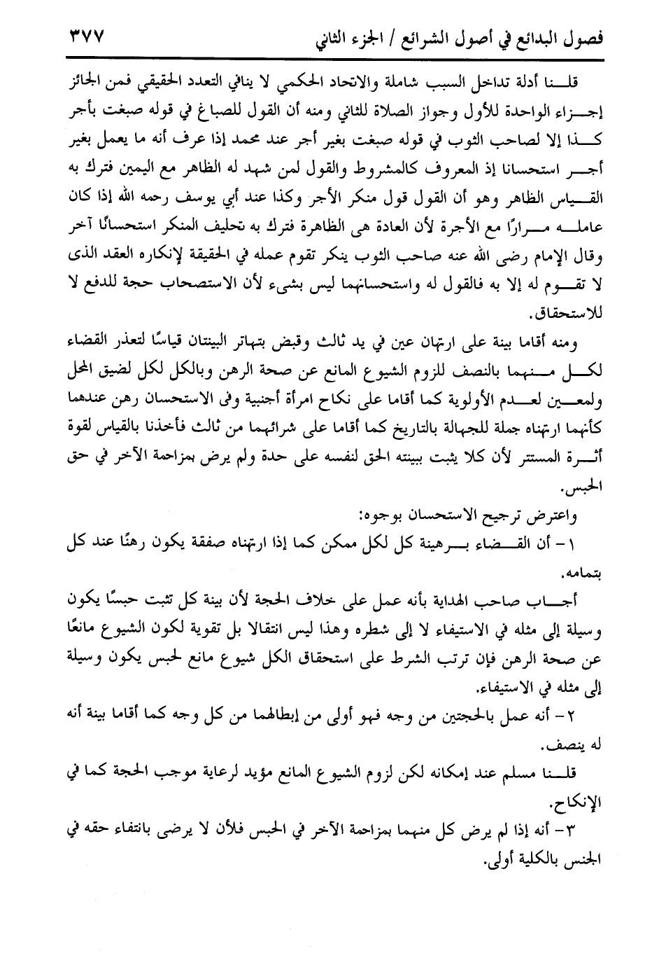 قلنا أدلة تداخل السبب شاملة والاتحاد الحكمي لا ينافي التعدد الحقيقي فمن الجائز إجزاء الواحدة للأول وجواز الصلاة للثاني ومنه أن القول للصباغ في قوله صبغت بأجر كذا إلا لصاحب الثوب في قوله صبغت بغير أجر عند محمَّد إذا عرف أنه ما يعمل بغير أجر استحسانا إذ المعروف كالمشروط والقول لمن شهد له الظاهر مع اليمين فترك به القياس الظاهر وهو أن القول قول منكر الأجر وكذا عند أبي يوسف رحمه الله إذاكان عامله مرارًا مع الأجرة لأن العادة هى الظاهرة فترك به تحليف المنكر استحسانًا آخر وقال الإِمام رضي الله عنه صاحب الثوب ينكر تقوم عمله في الحقيقة لإنكاره العقد الذي لا تقوم له إلا به فالقول له واستحسانهم إليس بشىء لأن الاستصحاب حجة للدفع لا للاستحقاق.
