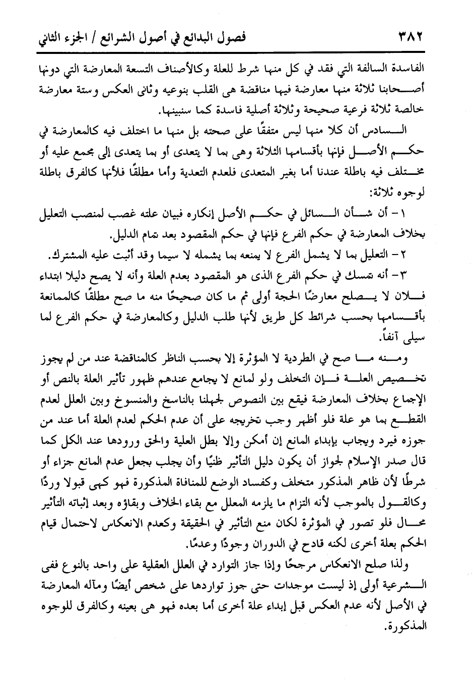 ولذا صلح الانعكاس مرجحًا وإذا جاز التوارد في العلل العقلية على واحد بالنوع ففى الشرعية أولى إذ ليست موجدات حتى جوز تواردها على شخص أيضًا ومآله المعارضة في الأصل لأنه عدم العكس قبل إبداء علة أخرى أما بعده فهو هى بعينه وكالفرق للوجوه المذكورة.