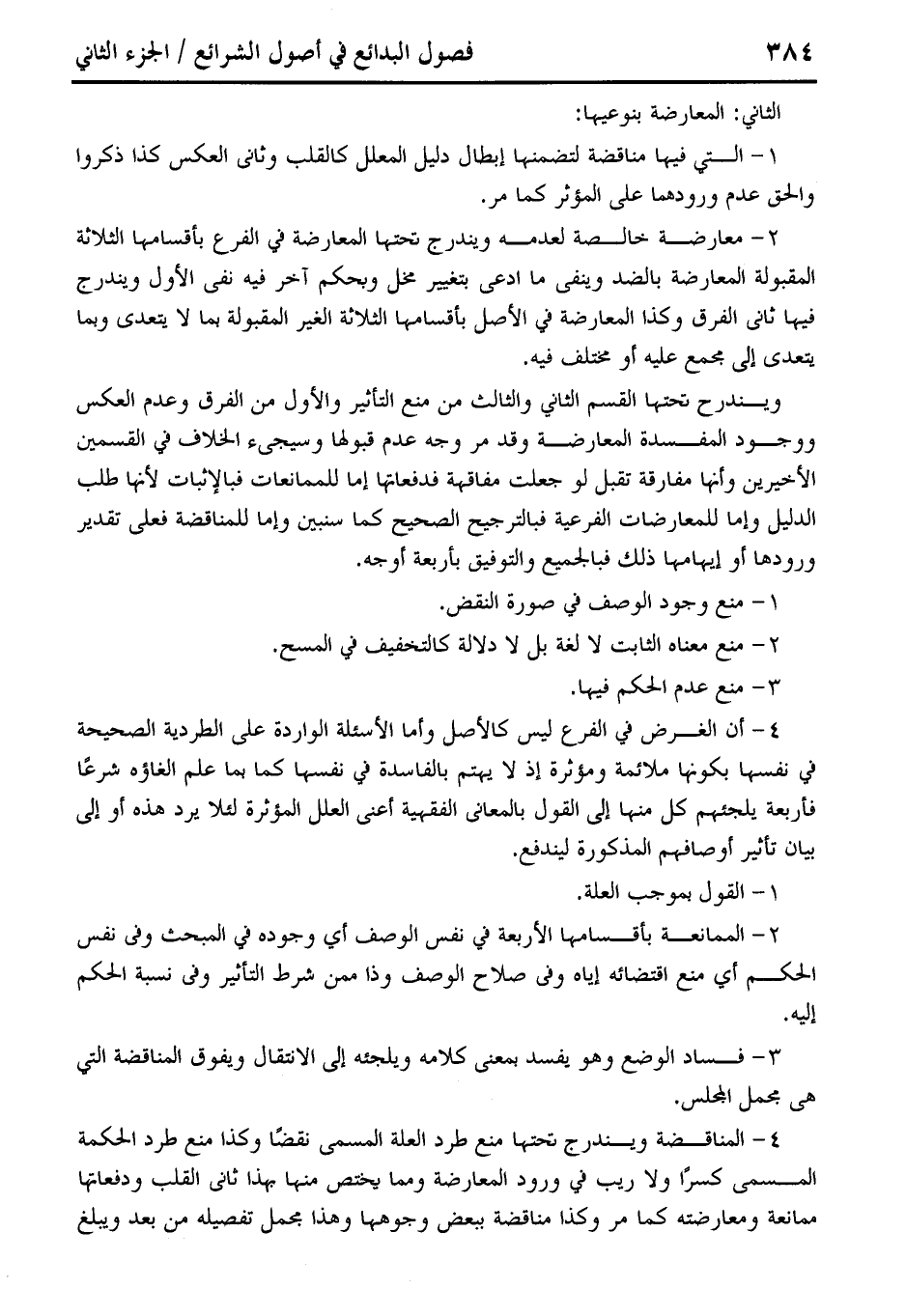 4 - المناقضة ويندرج تحتها منع طرد العلة المسمى نقضًا وكذا منع طرد الحكمة المسمى كسرًا ولا ريب في ورود المعارضة ومما يختص منها بهذا ثانى القلب ودفعاتها ممانعة ومعارضته كما مر وكذا مناقضة ببعض وجوهها وهذا مجمل تفصيله من بعد ويبلغ