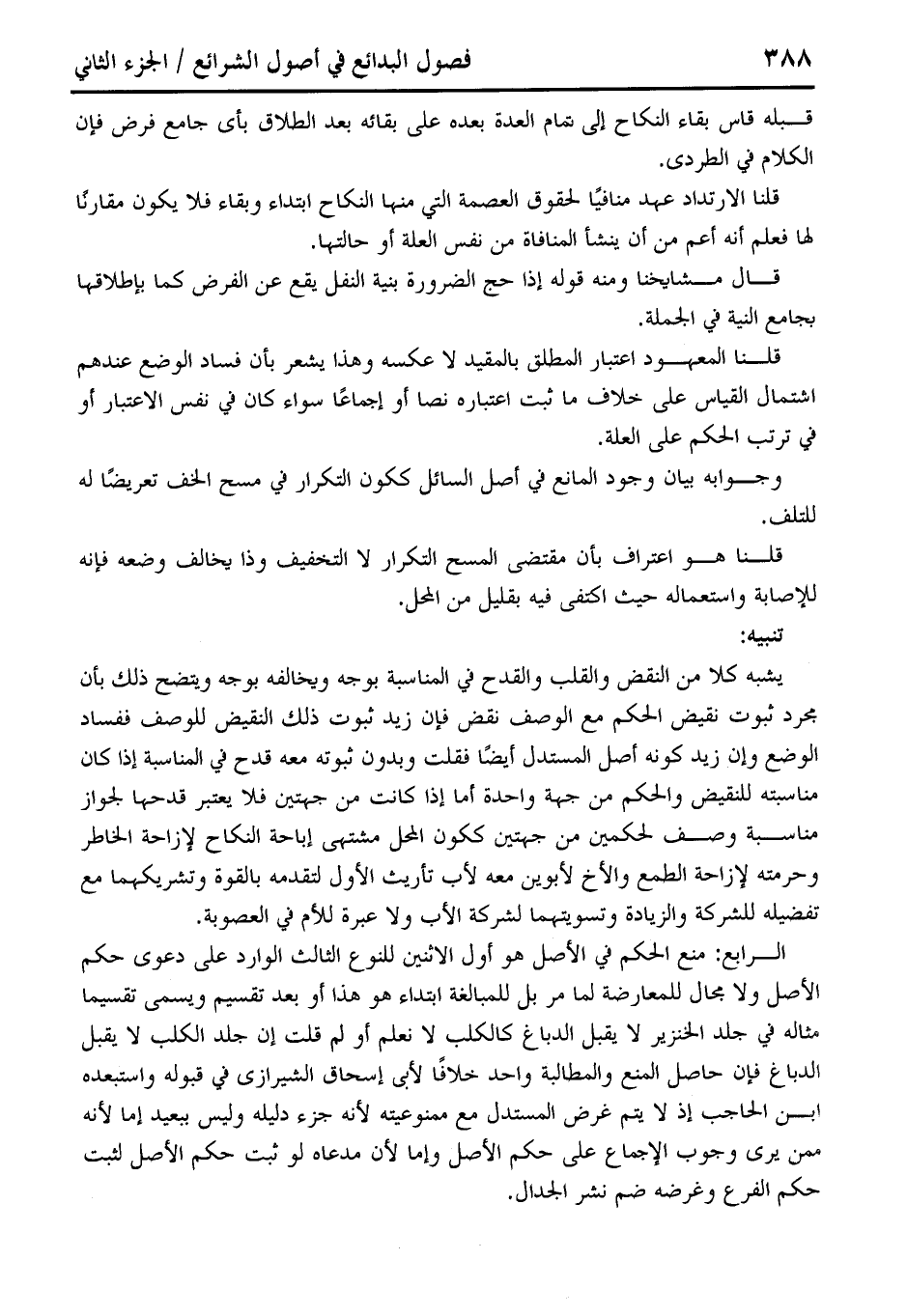 الرابع: منع الحكم في الأصل هو أول الاثنين للنوع الثالث الوارد على دعوى حكم الأصل ولا مجال للمعارضة لما مر بل للمبالغة ابتداء هو هذا أو بعد تقسيم ويسمى تقسيما مثاله في جلد الخنزير لا يقبل الدباغ كالكلب لا نعلم أو لم قلت إن جلد الكلب لا يقبل الدباغ فإن حاصل المنع والمطالبة واحد خلافًا لأبي إسحاق الشيرازى في قبوله واستبعده ابن الحاجب إذ لا يتم غرض المستدل مع ممنوعيته لأنه جزء دليله وليس ببعيد إما لأنه ممن يرى وجوب الإجماع على حكم الأصل وإما لأن مدعاه لو ثبت حكم الأصل لثبت حكم الفرع وغرضه ضم نشر الجدال.