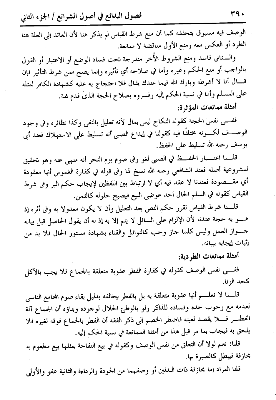 ففى نفس الوصف كقوله في كفارة الفطر عقوبة متعلقة بالجماع فلا يجب بالأكل كحد الزنا. قلنا لا نعلم أنها عقوبة متعلقة به بل بالفطر يخالفه بدليل بقاء صوم المجامع الناسي لعدمه مع وجوب حده وفساده للذاكر ولو بالوطئ الحلال لوجوده وبناؤه أن الجماع آلة الفطر فلا يقصد لعينه فاضطر الخصم إلى ذكر الفقه أن الفطر بالجط ع فوقه لغيره فلا يلحق به فيجاب بما مر قبل هذا من أمثلة الممانعة في نسبة الحكم إليه.