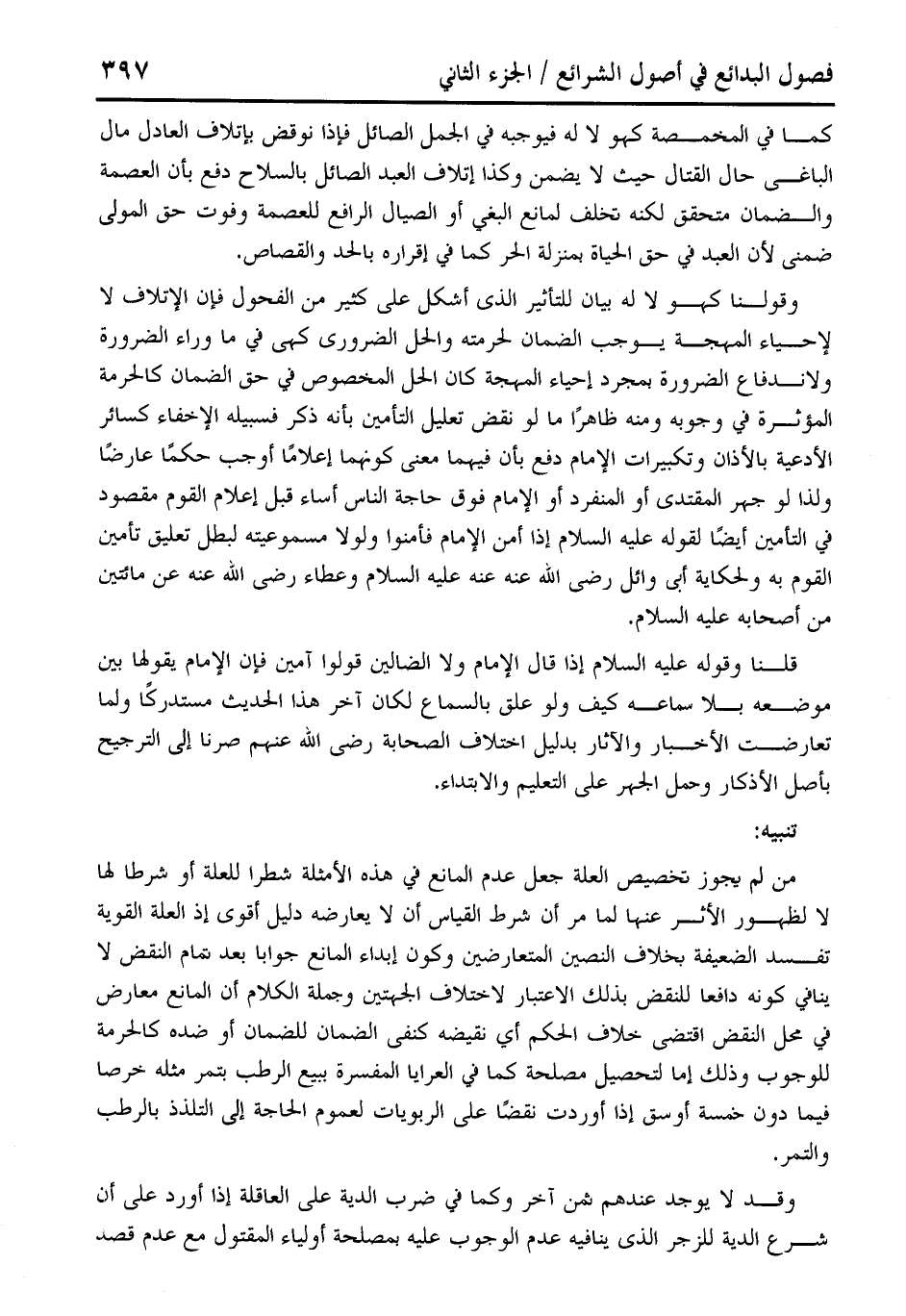 وقولنا كهو لا له بيان للتأثير الذي أشكل على كثير من الفحول فإن الإتلاف لا لإحياء المهجة يوجب الضمان لحرمته والحل الضرورى كهى في ما وراء الضرورة ولاندفاع الضرورة بمجرد إحياء المهجة كان الحل المخصوص في حق الضمان كالحرمة المؤثرة في وجوبه ومنه ظاهرًا ما لو نقض تعليل التأمين بأنه ذكر فسبيله الإخفاء كسائر الأدعية بالأذان وتكبيرات الإِمام دفع بأن فيهما معنى كونهما إعلامًا أوجب حكمًا عارضًا ولذا لو جهر المقتدي أو المنفرد أو الإِمام فوق حاجة الناس أساء قبل إعلام القوم مقصود في التأمين أيضًا لقوله عليه السلام إذا أمن الإِمام فأمنوا ولولا مسموعيته لبطل تعليق تأمين القوم به ولحكاية أبي وائل رضي الله عنه عليه السلام وعطاء رضي الله عنه عن مائتين من أصحابه عليه السلام.