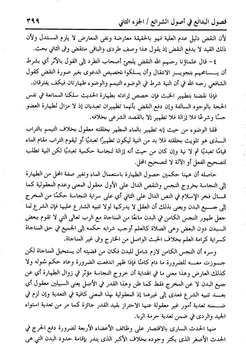 فإذا نقضنا بتطهير الخبث فإن خصص إرادته بطهارة الحديث سلكنا الممانعة في نفس الحجة بالوجوه السالفة وإن دفع النقض بأنهما تطهيران تعبديان إذ لا مزال لطهارة العضو حسًا وشرعًا فلا إزالة فلا تطهير إلا بالقصد الشرعي بخلافه.