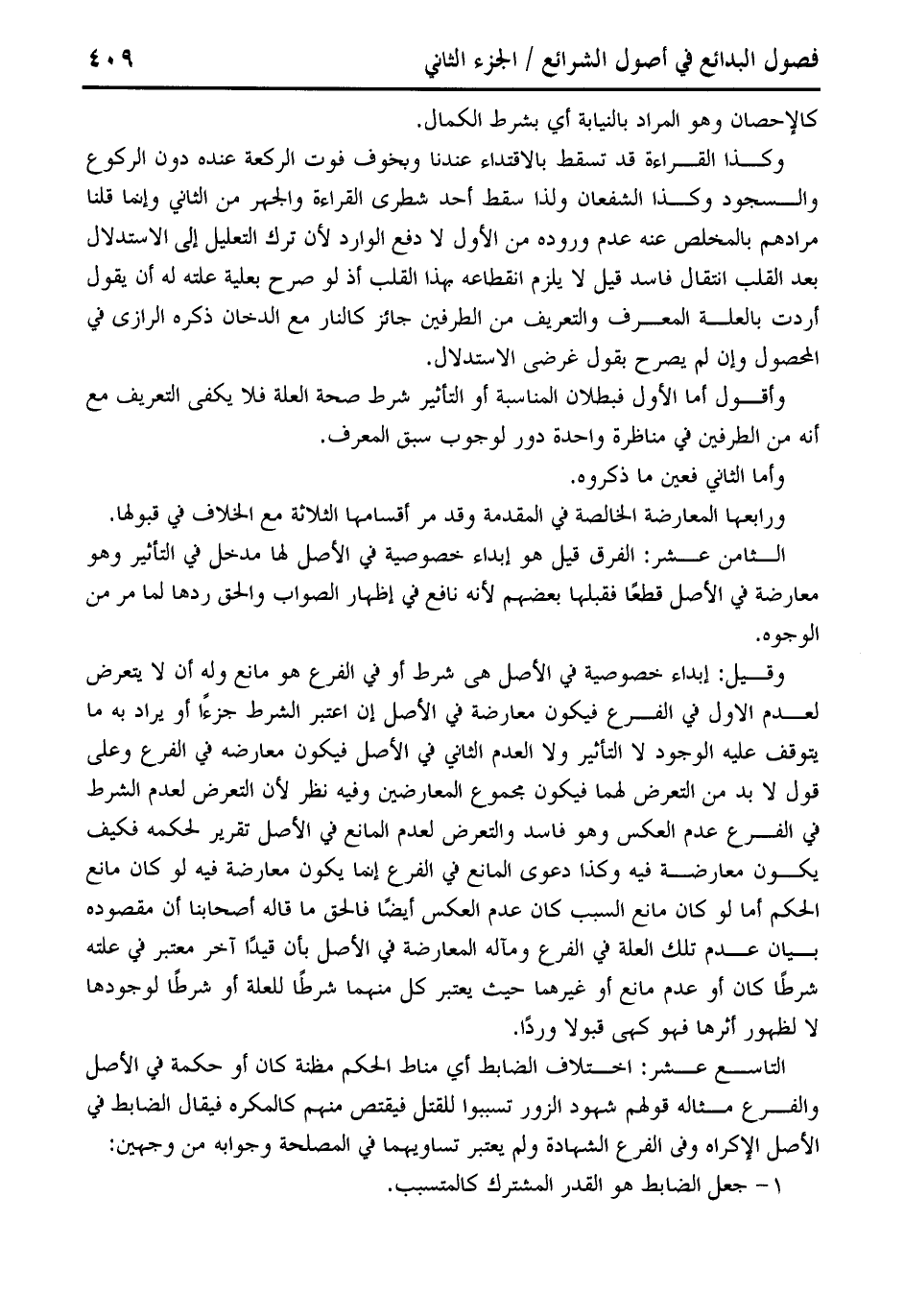 وقيل: إبداء خصوصية في الأصل هى شرط أو في الفرع هو مانع وله أن لا يتعرض لعدم الأول في الفرع فيكون معارضة في الأصل إن اعتبر الشرط جزءًا أو يراد به ما يتوقف عليه الوجود لا التأثير ولا العدم الثاني في الأصل فيكون معارضه في الفرع وعلى قول لا بد من التعرض لهما فيكون مجموع المعارضين وفيه نظر لأن التعرض لعدم الشرط في الفرع عدم العكس وهو فاسد والتعرض لعدم المانع في الأصل تقرير لحكمه فكيف يكون معارضة فيه وكذا دعوى المانع في الفرع إنما يكون معارضة فيه لوكان مانع الحكم أما لوكان مانع السبب كان عدم العكس أيضًا فالحق ما قاله أصحابنا أن مقصوده بيان عدم تلك العلة في الفرع ومآله المعارضة في الأصل بأن قيحًا آخر معتبر في علته شرطًا كان أو عدم مانع أو غيرهما حيث يعتبر كل منهما شرطًا للعلة أو شرطًا لوجودها لا لظهور أثرها فهو كهي قبولا وردًا.