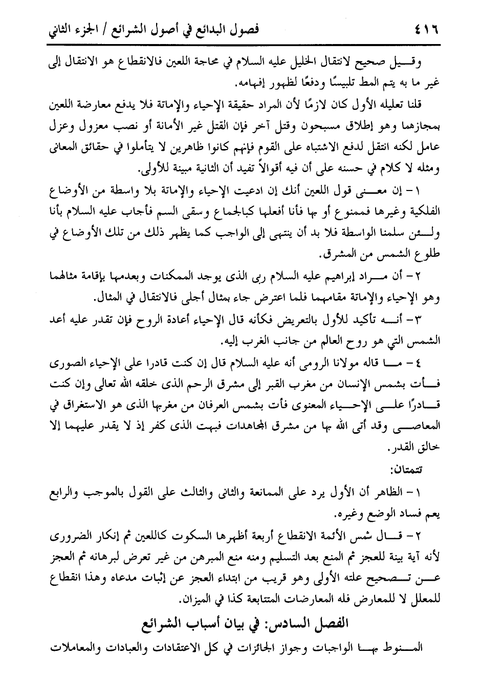 1 - إن معنى قول اللعين أنك إن ادعيت الإحياء والإماتة بلا واسطة من الأوضاع الفلكية وغيرها فممنوع أو بها فأنا أفعلها كبالجماع وسقي السم فأجاب عليه السلام بأنا ولئن سلمنا الواسطة فلا بد أن ينتهى إلى الواجب كما يظهر ذلك من تلك الأوضاع في طلوع الشمس من المشرق.