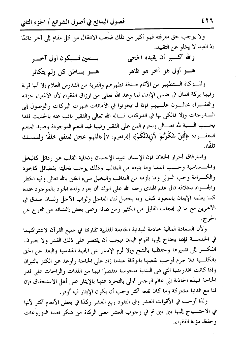 وللزكاة التطهير من الآثام صدقة تطهرهم والقربة من القدوس العلام إلا أنها قربة وفيها بركة المال في ضمن الإيفاء لما وعد الله تعالى من ارزاق الفقراء لأن الأغنياء خزانه والفقراء محالون عليهم فإذا لم يخونوا في الأمانات ظهرت البركات والوصول إلى الدرجات وإلا فالكى بها في الدركات قاله الله تعالى والفقير نائب عنه بالحديث فلذا يجب النية لله تعالى ويحرم المن على الفقير وفيها قيد النعم الموجودة وصيد المنعم المفقودة {لَئِنْ شَكَرْتُمْ لَأَزِيدَنَّكُمْ} [إبراهيم: 7] "اللهم عجل لمنفق خلفًا ولممسك تلفًا". واسترقاق أحرار الخلان فإن الإنسان عبيد الإحسان وتخلية القلب عن رذائل كالبخل والحساسية وحب الدنيا وما يتبعه من المثالب وذلك يوجب تحليته بفضائل كالجود والكرامة وحب المولى وما يلزمه من المناقب والبخيل سيىء الظن بالله تعالى وفيه الخطر والجواد بخلافه قال علم الهدى رحمه الله على الولد أن يعود ولده الجود بالموجود عنده كما يعلمه الإيمان بالمعبود كيف وبه يحصل ثناء العاجل وثواب الآجل ولسان صدق في الآخرين مع ما في إيجاب القليل من الكثير ومن نمائه وعلى بعض إغشائه من الفرج عن الحرج.