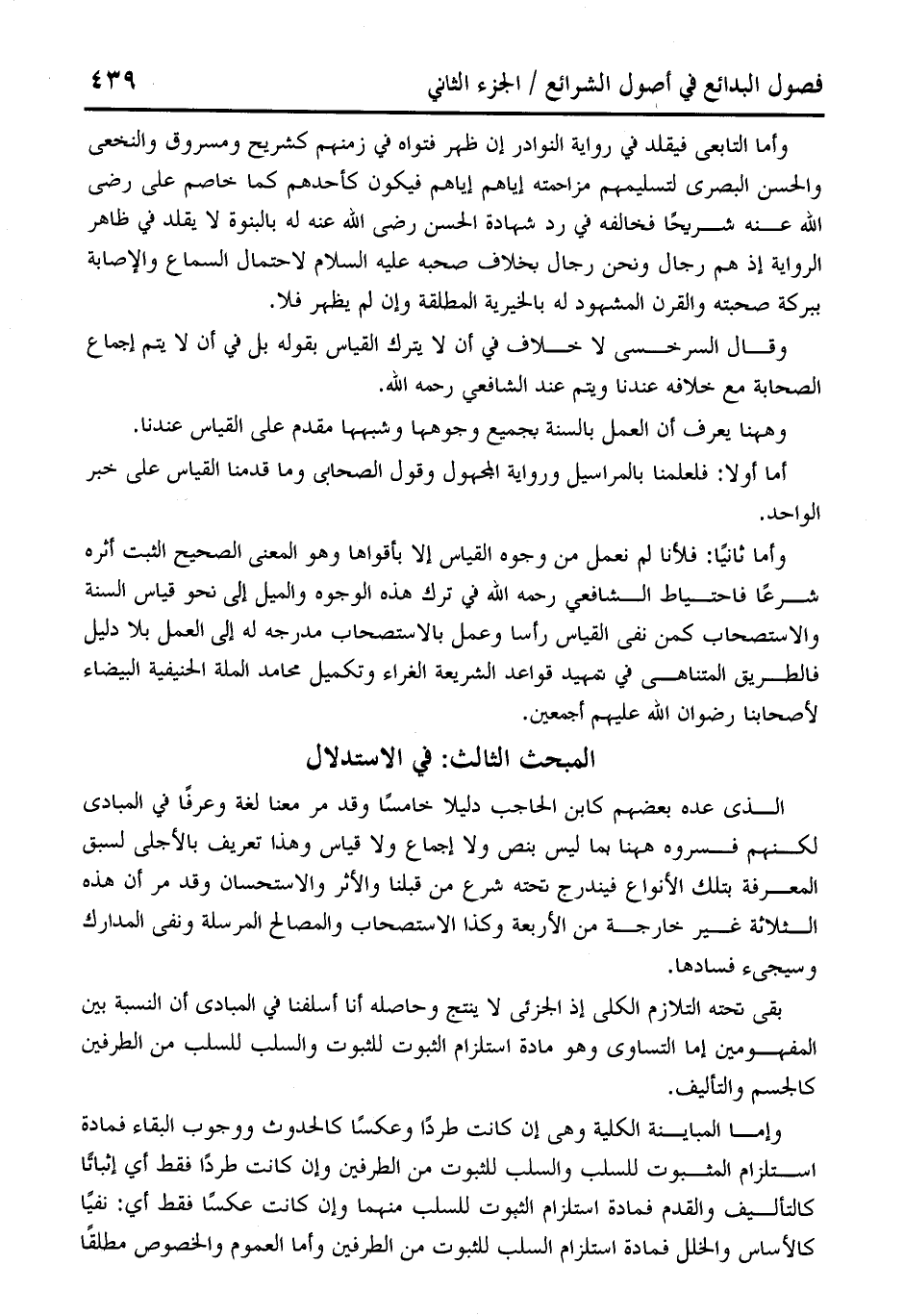 وأما ثانيًا: فلأنا لم نعمل من وجوه القياس إلا بأقواها وهو المعنى الصحيح المثبت أثره شرعًا فاحتياط الشافعي رحمه الله في ترك هذه الوجوه والميل إلى نحو قياس السنة والاستصحاب كمن نفى القياس رأسا وعمل بالاستصحاب مدرجه له إلى العمل بلا دليل فالطريق المتناهي في تمهيد قواعد الشريعة الغراء وتكميل محامد الملة الحنيفية البيضاء لأصحابنا رضوان الله عليهم أجمعين.